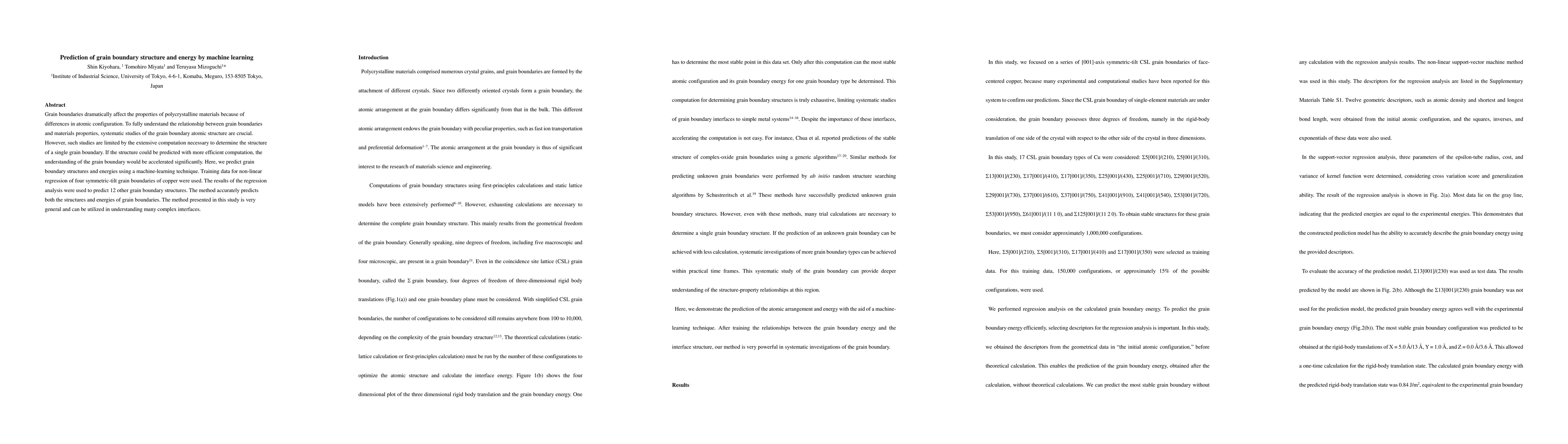 This paper employs machine learning to predict the structures and energies of grain boundaries in polycrystalline materials, significantly reducing the computational effort required for such studies. The method successfully predicts the configurations and energies of 12 grain boundary structures using training data from four initial boundaries.