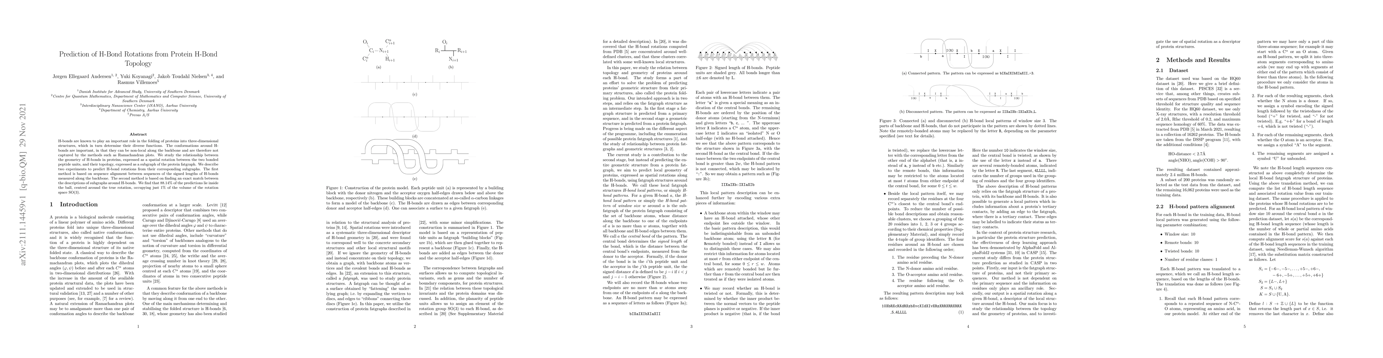 This research presents two methods to predict H-bond rotations in proteins using their topology. The first method uses sequence alignment of H-bond lengths, while the second finds exact subgraph matches. Both methods achieve high accuracy, with 88.14% predictions within 1% of the rotation space SO(3).