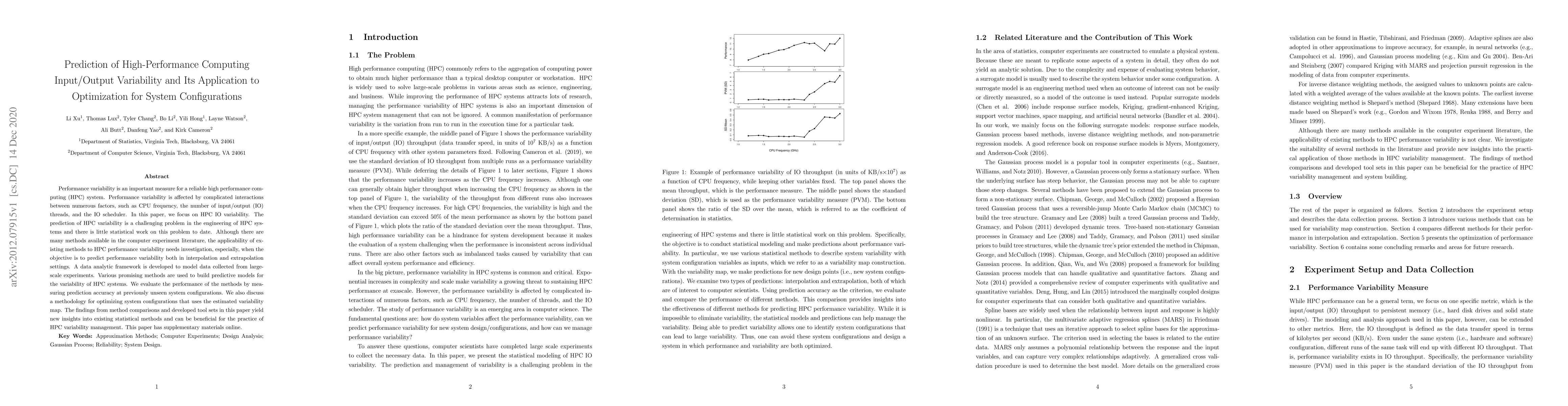 Performance variability is an important measure for a reliable high performance computing (HPC) system. Performance variability is affected by complicated interactions between numerous factors, such as CPU frequency, the number of input/output (IO) threads, and the IO scheduler. In this paper, we focus on HPC IO variability. The prediction of HPC variability is a challenging problem in the engineering of HPC systems and there is little statistical work on this problem to date. Although there are many methods available in the computer experiment literature, the applicability of existing methods to HPC performance variability needs investigation, especially, when the objective is to predict performance variability both in interpolation and extrapolation settings. A data analytic framework is developed to model data collected from large-scale experiments. Various promising methods are used to build predictive models for the variability of HPC systems. We evaluate the performance of the methods by measuring prediction accuracy at previously unseen system configurations. We also discuss a methodology for optimizing system configurations that uses the estimated variability map. The findings from method comparisons and developed tool sets in this paper yield new insights into existing statistical methods and can be beneficial for the practice of HPC variability management. This paper has supplementary materials online.