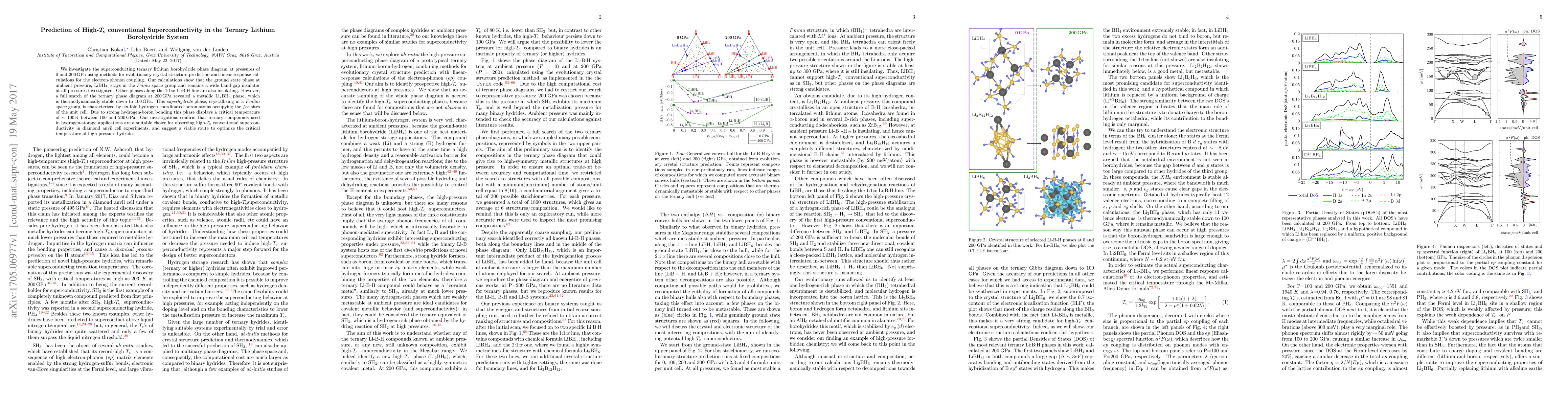 We investigate the superconducting ternary lithium borohydride phase diagram at pressures of 0 and 200$\,$GPa using methods for evolutionary crystal structure prediction and linear-response calculations for the electron-phonon coupling. Our calculations show that the ground state phase at ambient pressure, LiBH$_4$, stays in the $Pnma$ space group and remains a wide band-gap insulator at all pressures investigated. Other phases along the 1:1:$x$ Li:B:H line are also insulating. However, a full search of the ternary phase diagram at 200$\,$GPa revealed a metallic Li$_2$BH$_6$ phase, which is thermodynamically stable down to 100$\,$GPa. This {\em superhydride} phase, crystallizing in a $Fm\bar{3}m$ space group, is characterized by six-fold hydrogen-coordinated boron atoms occupying the $fcc$ sites of the unit cell. Due to strong hydrogen-boron bonding this phase displays a critical temperature of $\sim$ 100$\,$K between 100 and 200$\,$GPa. Our investigations confirm that ternary compounds used in hydrogen-storage applications are a suitable choice for observing high-$T_\text{c}$ conventional superconductivity in diamond anvil cell experiments, and suggest a viable route to optimize the critical temperature of high-pressure hydrides.