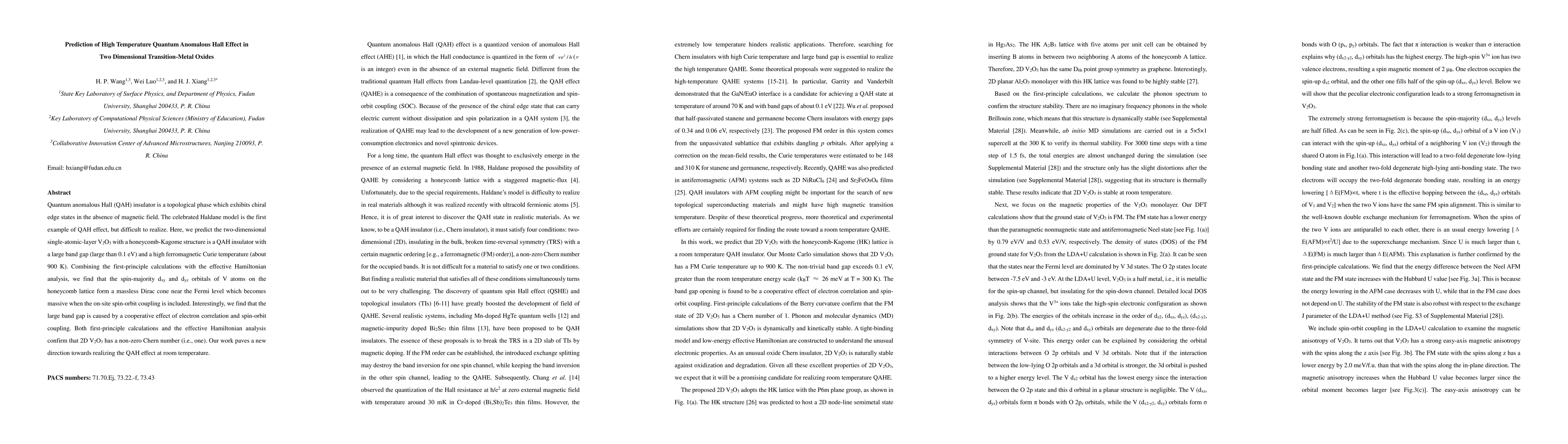 This paper predicts that two-dimensional single-atomic-layer V2O3 with a honeycomb-Kagome structure exhibits a high-temperature quantum anomalous Hall effect with a large band gap and a Curie temperature of about 900 K. The study combines first-principle calculations and effective Hamiltonian analysis to confirm its non-zero Chern number, indicating potential for realizing the QAH effect at room temperature.