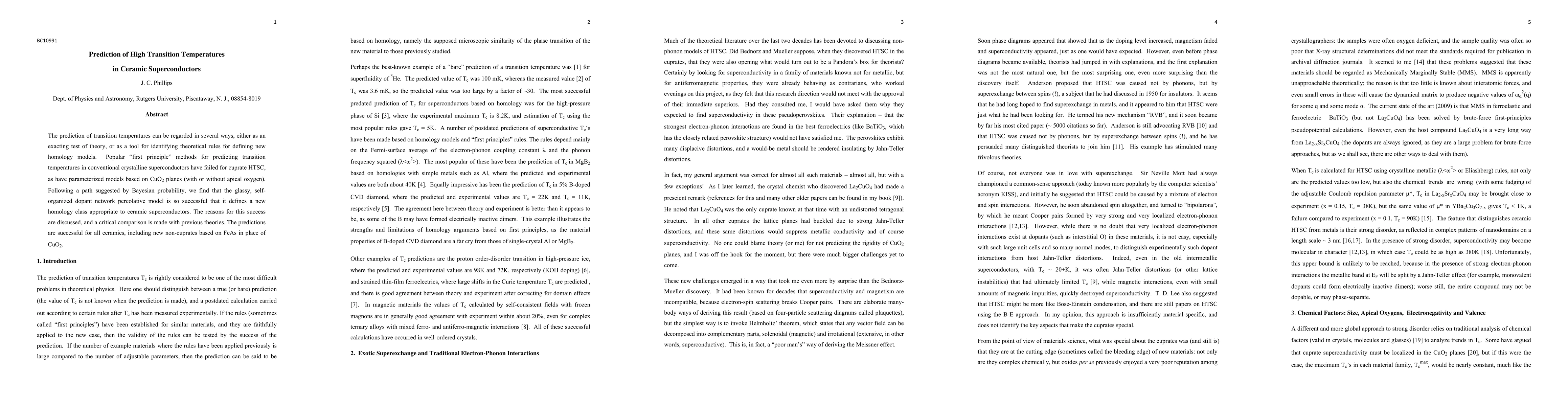 The prediction of transition temperatures can be regarded in several ways, either as an exacting test of theory, or as a tool for identifying theoretical rules for defining new homology models. Popular "first principle" methods for predicting transition temperatures in conventional crystalline superconductors have failed for cuprate HTSC, as have parameterized models based on CuO2 planes (with or without apical oxygen). Following a path suggested by Bayesian probability, we find that the glassy, self-organized dopant network percolative model is so successful that it defines a new homology class appropriate to ceramic superconductors. The reasons for this success are discussed, and a critical comparison is made with previous theories. The predictions are successful for all ceramics, including new non-cuprates based on FeAs in place of CuO2.