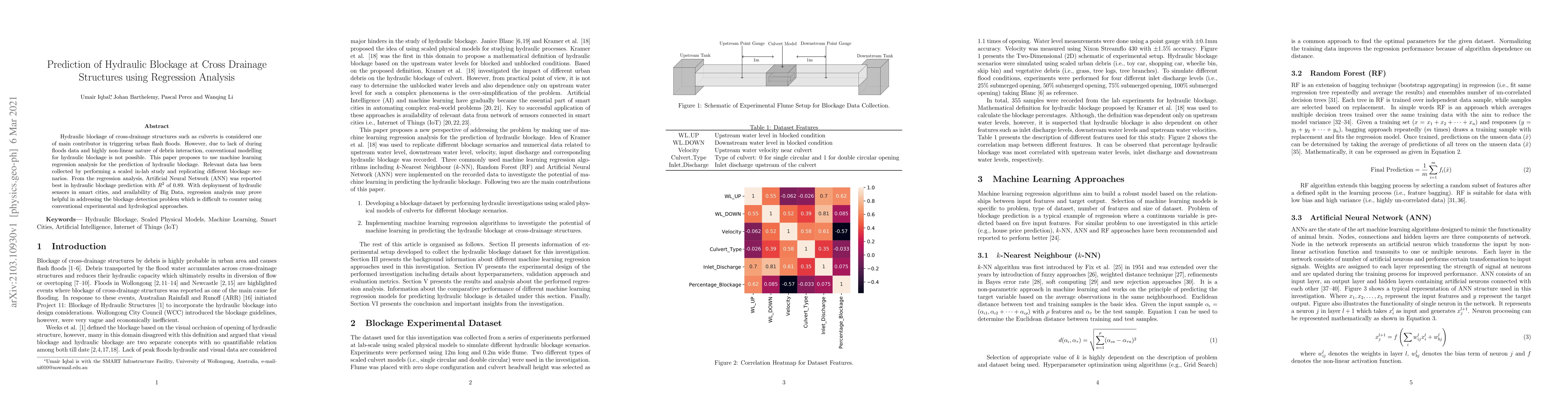 This paper proposes using machine learning regression analysis, specifically Artificial Neural Networks (ANN), to predict hydraulic blockage in cross-drainage structures, achieving a high $R^2$ of 0.89. The study suggests that this approach could be valuable for urban flash flood prevention in smart cities with advanced sensor networks.