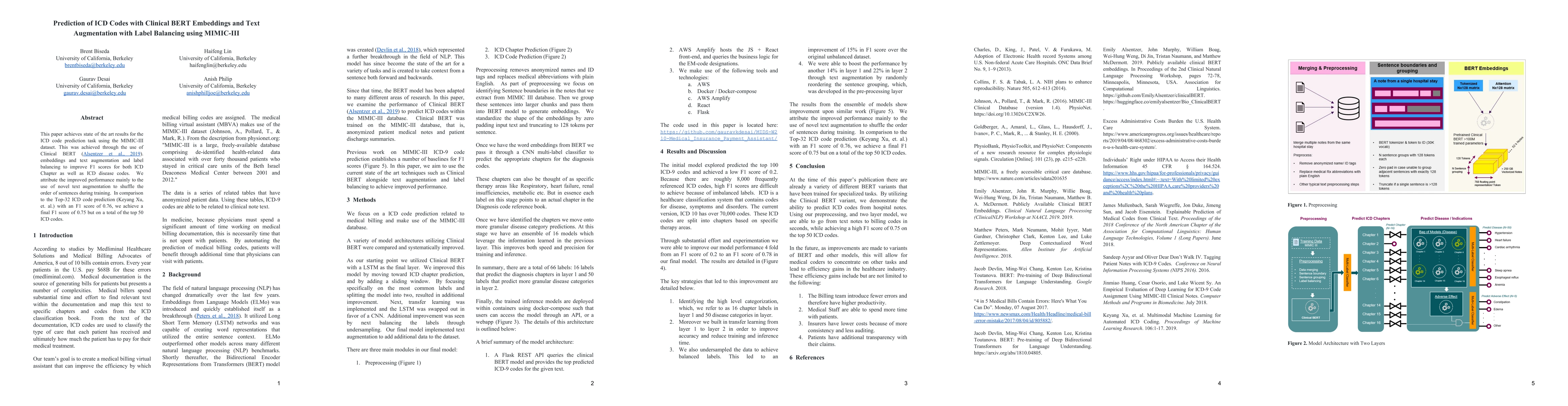 This paper achieves state of the art results for the ICD code prediction task using the MIMIC-III dataset. This was achieved through the use of Clinical BERT (Alsentzer et al., 2019). embeddings and text augmentation and label balancing to improve F1 scores for both ICD Chapter as well as ICD disease codes. We attribute the improved performance mainly to the use of novel text augmentation to shuffle the order of sentences during training. In comparison to the Top-32 ICD code prediction (Keyang Xu, et. al.) with an F1 score of 0.76, we achieve a final F1 score of 0.75 but on a total of the top 50 ICD codes.
