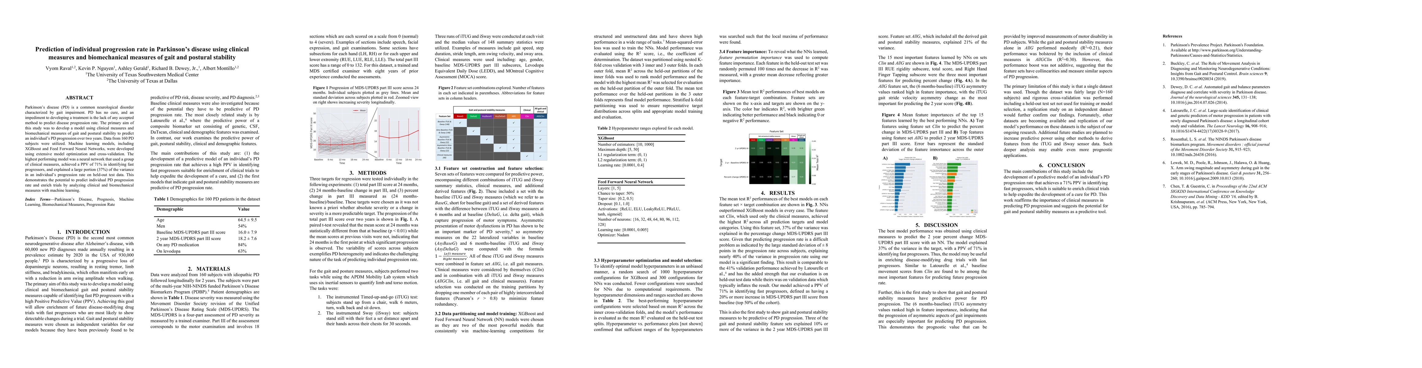This study developed a machine learning model using clinical and biomechanical measures to predict individual progression rates in Parkinson's disease over two years. A neural network model achieved a 71% positive predictive value for identifying fast progressors, indicating potential for enriching clinical trials.