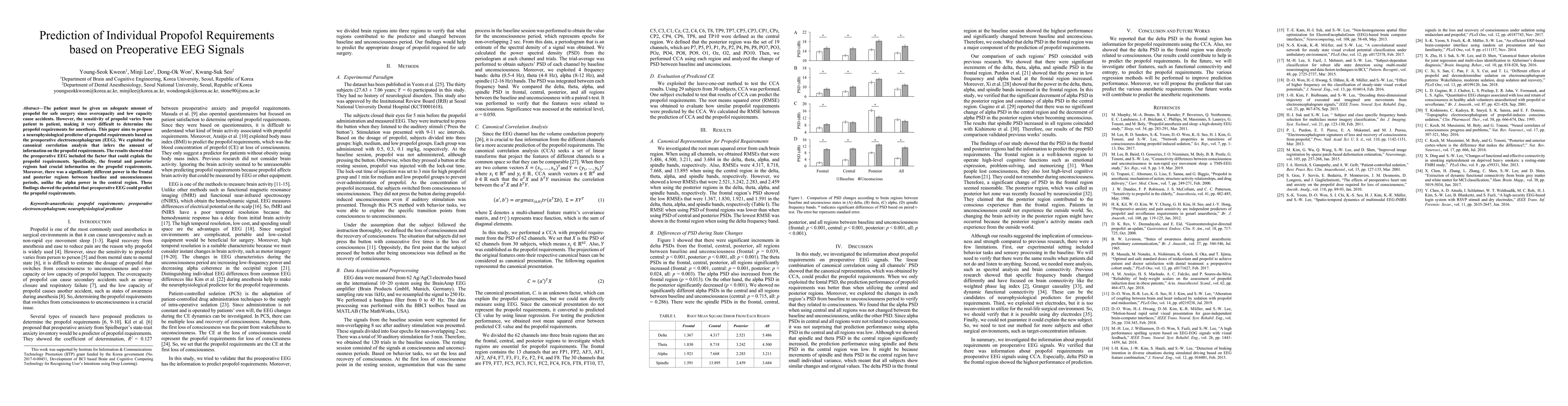 This paper proposes a neurophysiological predictor for individual propofol requirements based on preoperative EEG signals, suggesting that frontal and posterior EEG regions contain crucial information. The study found significant differences in power between baseline and unconsciousness periods, indicating preoperative EEG's potential to predict propofol needs.