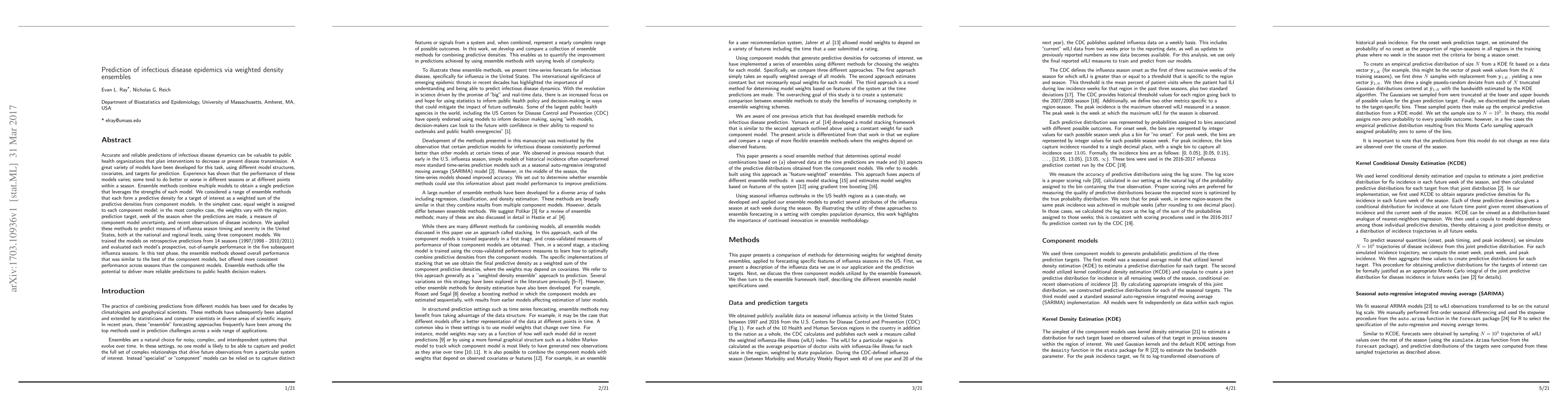 Accurate and reliable predictions of infectious disease dynamics can be valuable to public health organizations that plan interventions to decrease or prevent disease transmission. A great variety of models have been developed for this task, using different model structures, covariates, and targets for prediction. Experience has shown that the performance of these models varies; some tend to do better or worse in different seasons or at different points within a season. Ensemble methods combine multiple models to obtain a single prediction that leverages the strengths of each model. We considered a range of ensemble methods that each form a predictive density for a target of interest as a weighted sum of the predictive densities from component models. In the simplest case, equal weight is assigned to each component model; in the most complex case, the weights vary with the region, prediction target, week of the season when the predictions are made, a measure of component model uncertainty, and recent observations of disease incidence. We applied these methods to predict measures of influenza season timing and severity in the United States, both at the national and regional levels, using three component models. We trained the models on retrospective predictions from 14 seasons (1997/1998 - 2010/2011) and evaluated each model's prospective, out-of-sample performance in the five subsequent influenza seasons. In this test phase, the ensemble methods showed overall performance that was similar to the best of the component models, but offered more consistent performance across seasons than the component models. Ensemble methods offer the potential to deliver more reliable predictions to public health decision makers.