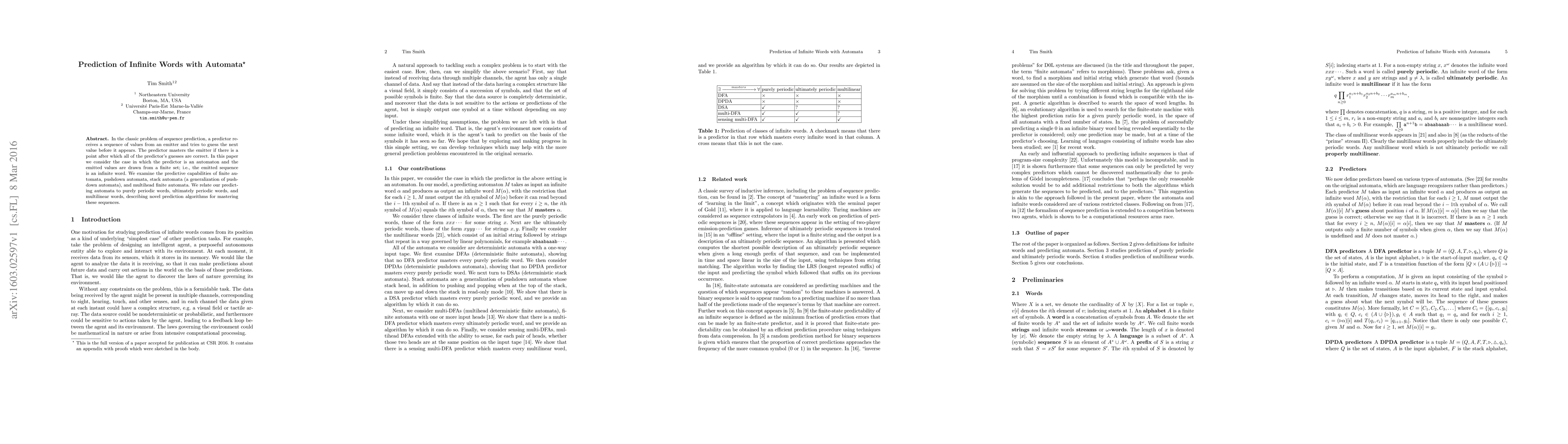 In the classic problem of sequence prediction, a predictor receives a sequence of values from an emitter and tries to guess the next value before it appears. The predictor masters the emitter if there is a point after which all of the predictor's guesses are correct. In this paper we consider the case in which the predictor is an automaton and the emitted values are drawn from a finite set; i.e., the emitted sequence is an infinite word. We examine the predictive capabilities of finite automata, pushdown automata, stack automata (a generalization of pushdown automata), and multihead finite automata. We relate our predicting automata to purely periodic words, ultimately periodic words, and multilinear words, describing novel prediction algorithms for mastering these sequences.