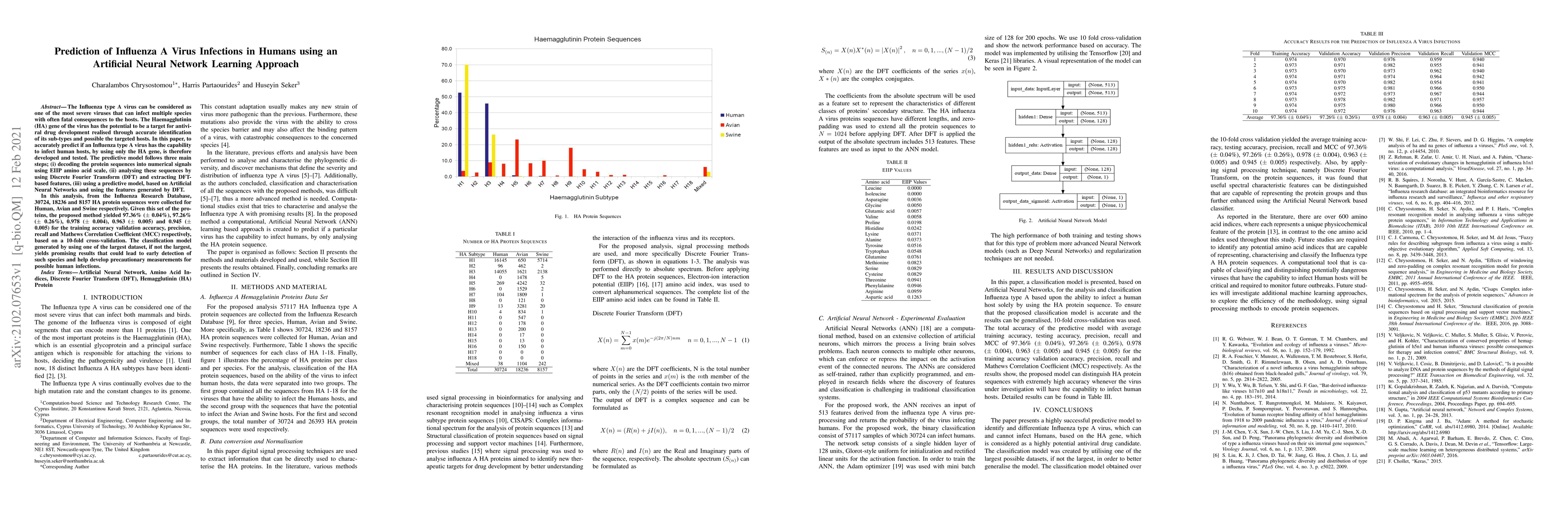 This paper develops an Artificial Neural Network model to predict Influenza A virus infections in humans using the Haemagglutinin (HA) gene. The model processes HA protein sequences through numerical decoding, feature extraction via Discrete Fourier Transform, and achieves high accuracy metrics, indicating potential for early detection and antiviral drug development.