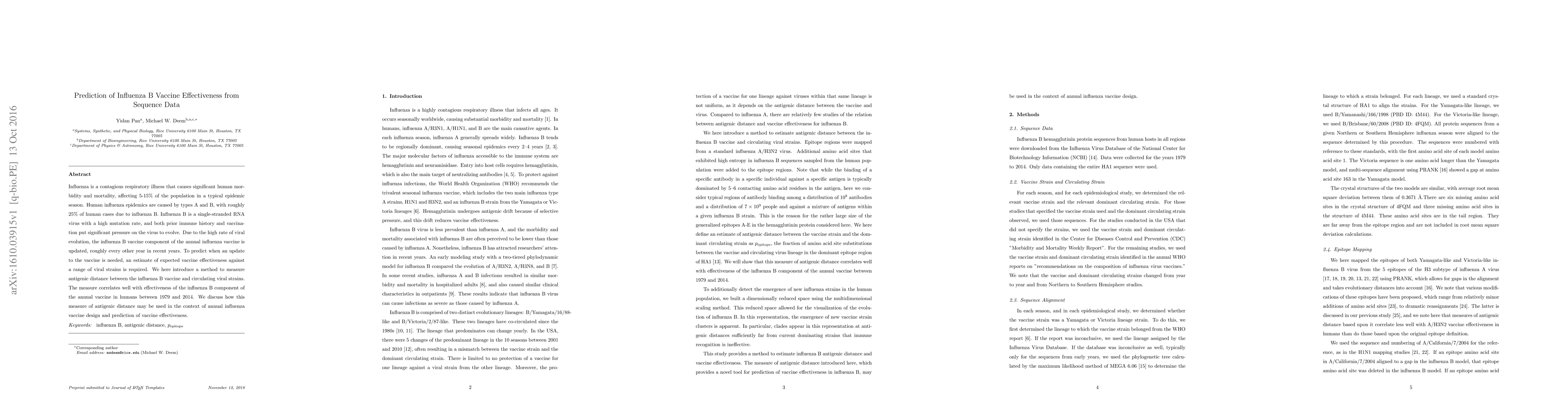 This paper introduces a method for predicting the effectiveness of the influenza B vaccine by measuring antigenic distance between vaccine strains and circulating viral strains. The method correlates well with observed vaccine effectiveness from 1979 to 2014 and could inform the design of updated influenza vaccines.