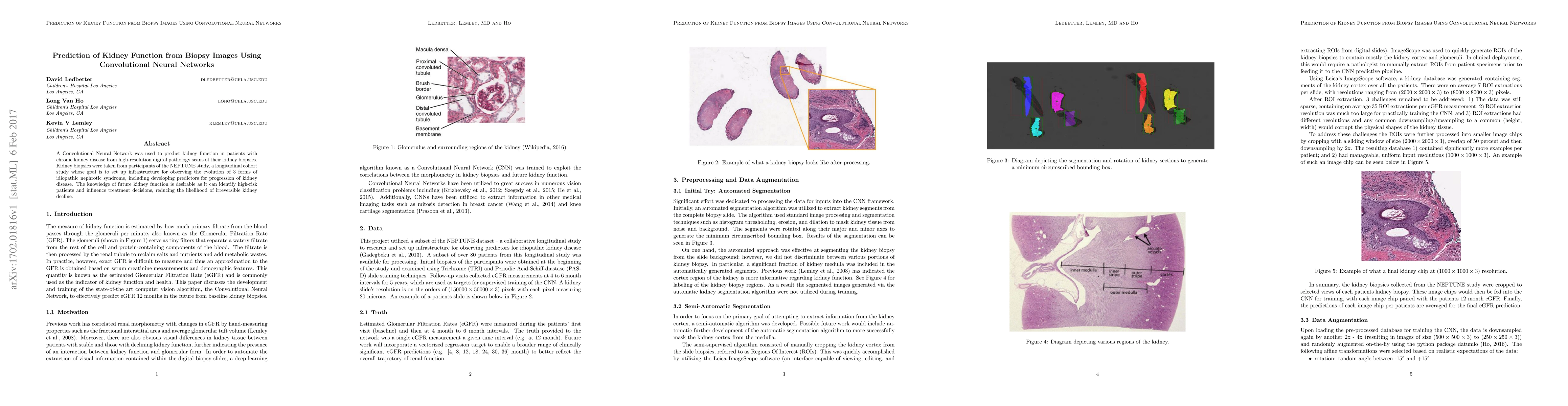 A Convolutional Neural Network was used to predict kidney function in patients with chronic kidney disease from high-resolution digital pathology scans of their kidney biopsies. Kidney biopsies were taken from participants of the NEPTUNE study, a longitudinal cohort study whose goal is to set up infrastructure for observing the evolution of 3 forms of idiopathic nephrotic syndrome, including developing predictors for progression of kidney disease. The knowledge of future kidney function is desirable as it can identify high-risk patients and influence treatment decisions, reducing the likelihood of irreversible kidney decline.