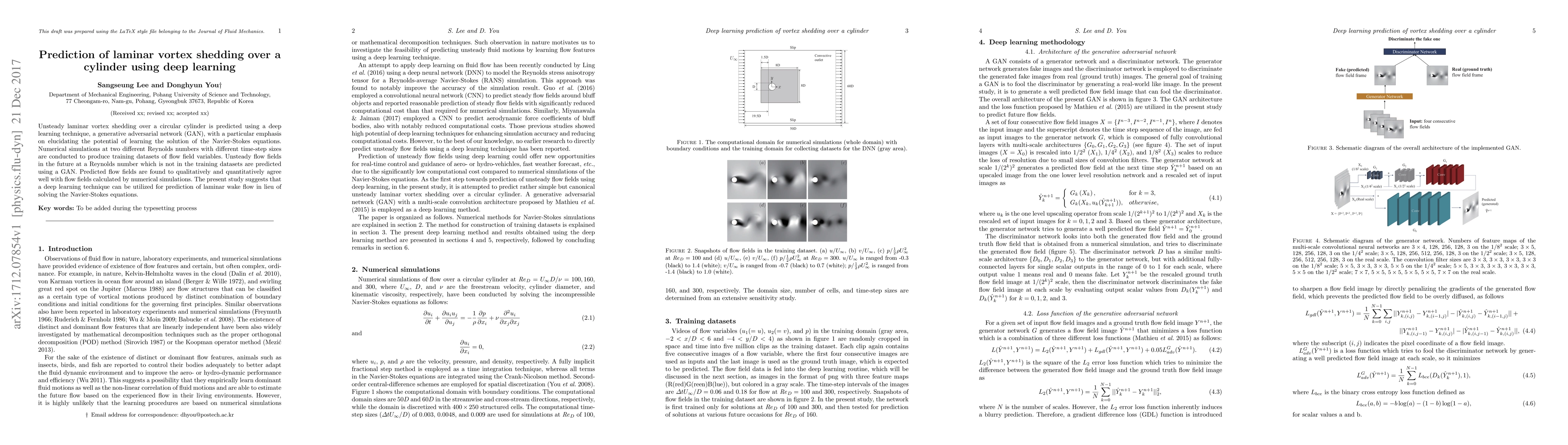 This paper uses a generative adversarial network (GAN) to predict unsteady laminar vortex shedding over a cylinder, demonstrating its potential to learn solutions of the Navier-Stokes equations. The GAN successfully predicts future flow fields at a Reynolds number not seen during training, showing good qualitative and quantitative agreement with numerical simulations.