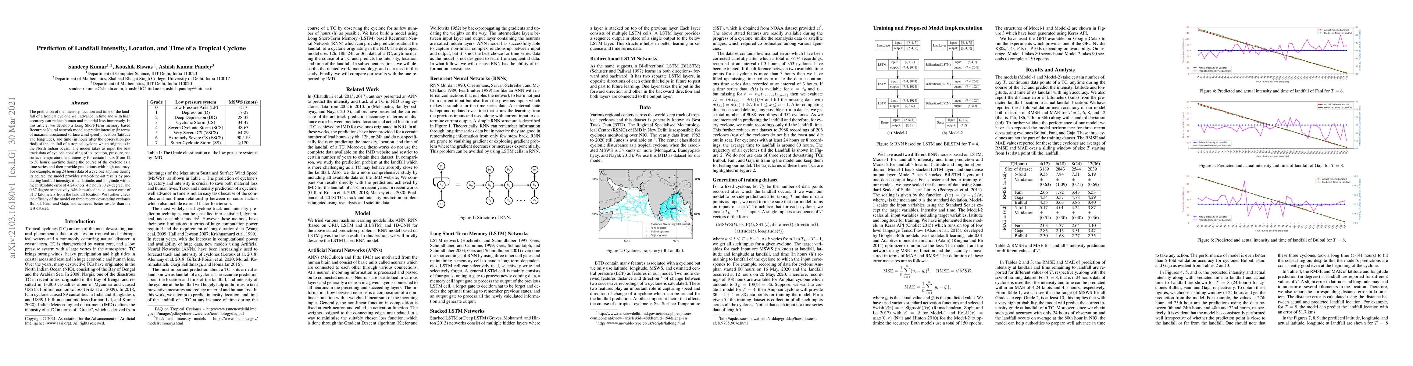 This paper develops a Long Short-Term memory based Recurrent Neural network model to predict the intensity, location, and time of landfall for tropical cyclones in the North Indian Ocean. The model achieves state-of-the-art results with mean absolute errors of 4.24 knots, 4.5 hours, 0.24 degree, and 0.37 degree, respectively, demonstrating its efficacy on recent cyclones.