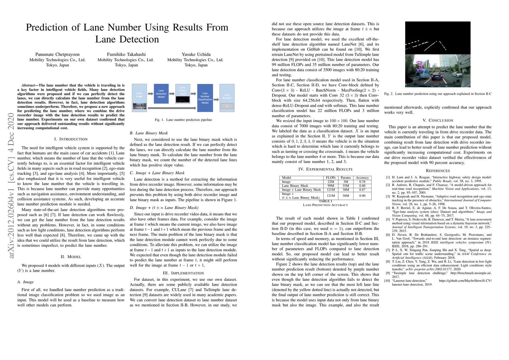 This paper proposes a method to predict lane number by combining drive recorder images with lane detection results, achieving high accuracy even when lane detection algorithms underperform. Experimental results show that the approach performs well without a significant increase in computational cost.