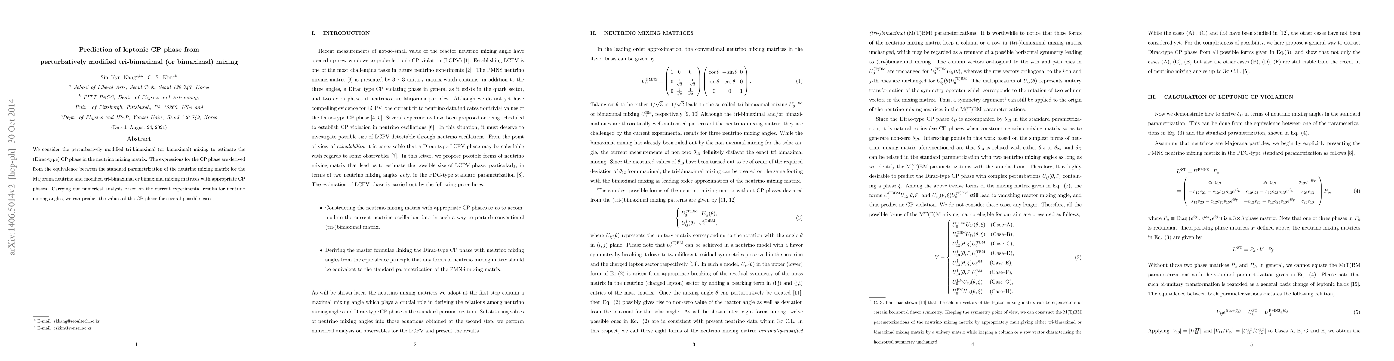 This paper explores the prediction of the Dirac-type CP phase in neutrino mixing using perturbatively modified tribimaximal or bimaximal mixing schemes. It derives expressions for the CP phase from the equivalence between standard and modified mixing matrices, and predicts CP phase values based on current experimental data.
