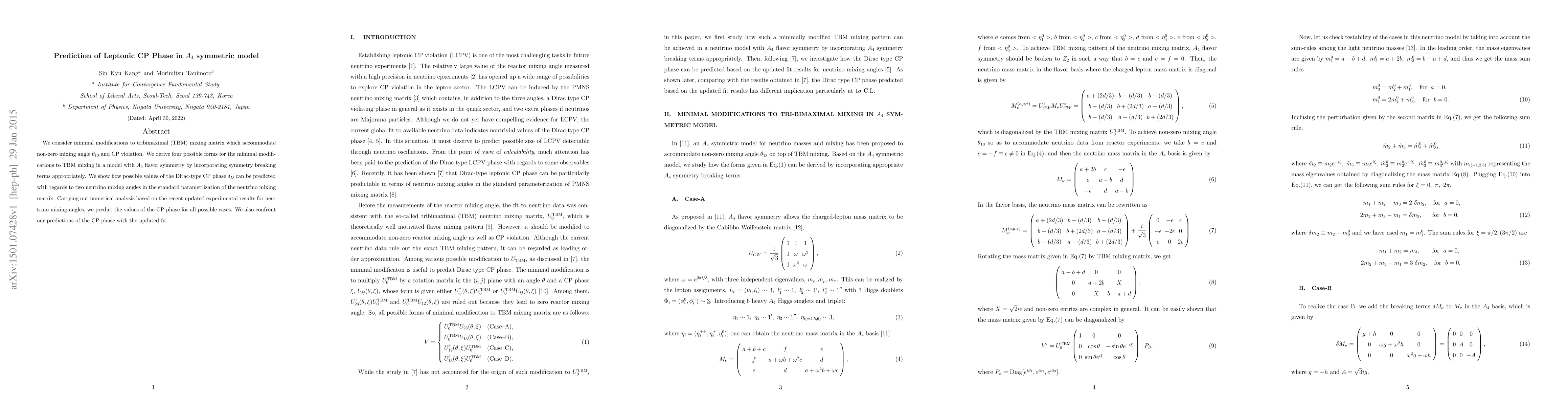 We consider minimal modifications to tribimaximal (TBM) mixing matrix which accommodate non-zero mixing angle $\theta_{13}$ and CP violation. We derive four possible forms for the minimal modifications to TBM mixing in a model with $A_4$ flavor symmetry by incorporating symmetry breaking terms appropriately. We show how possible values of the Dirac-type CP phase $\delta_D$ can be predicted with regards to two neutrino mixing angles in the standard parametrization of the neutrino mixing matrix. Carrying out numerical analysis based on the recent updated experimental results for neutrino mixing angles, we predict the values of the CP phase for all possible cases. We also confront our predictions of the CP phase with the updated fit.