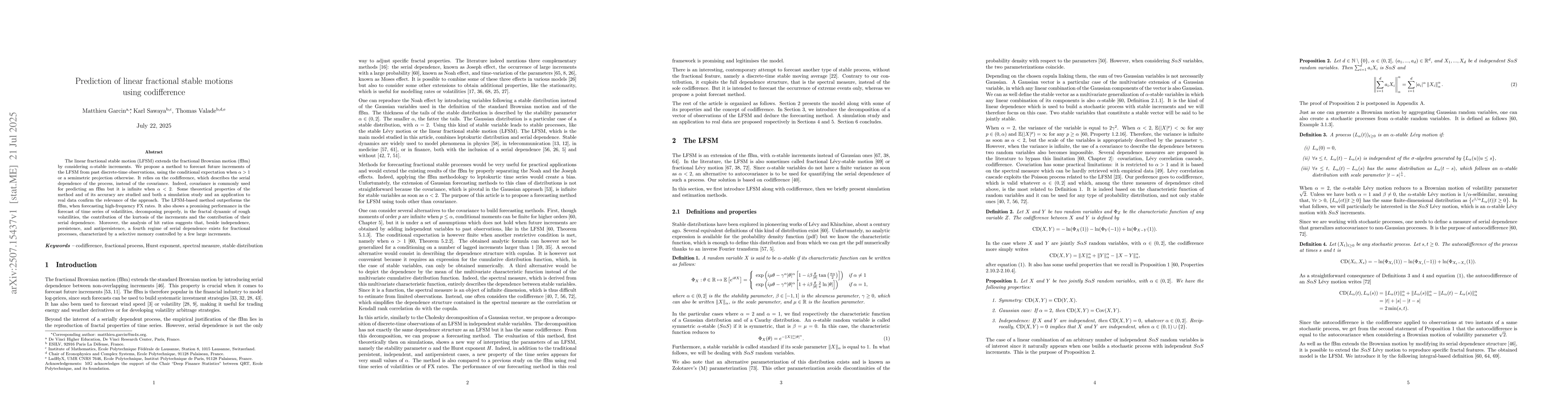The linear fractional stable motion (LFSM) extends the fractional Brownian motion (fBm) by considering $\alpha$-stable increments. We propose a method to forecast future increments of the LFSM from past discrete-time observations, using the conditional expectation when $\alpha>1$ or a semimetric projection otherwise. It relies on the codifference, which describes the serial dependence of the process, instead of the covariance. Indeed, covariance is commonly used for predicting an fBm but it is infinite when $\alpha<2$. Some theoretical properties of the method and of its accuracy are studied and both a simulation study and an application to real data confirm the relevance of the approach. The LFSM-based method outperforms the fBm, when forecasting high-frequency FX rates. It also shows a promising performance in the forecast of time series of volatilities, decomposing properly, in the fractal dynamic of rough volatilities, the contribution of the kurtosis of the increments and the contribution of their serial dependence. Moreover, the analysis of hit ratios suggests that, beside independence, persistence, and antipersistence, a fourth regime of serial dependence exists for fractional processes, characterized by a selective memory controlled by a few large increments.