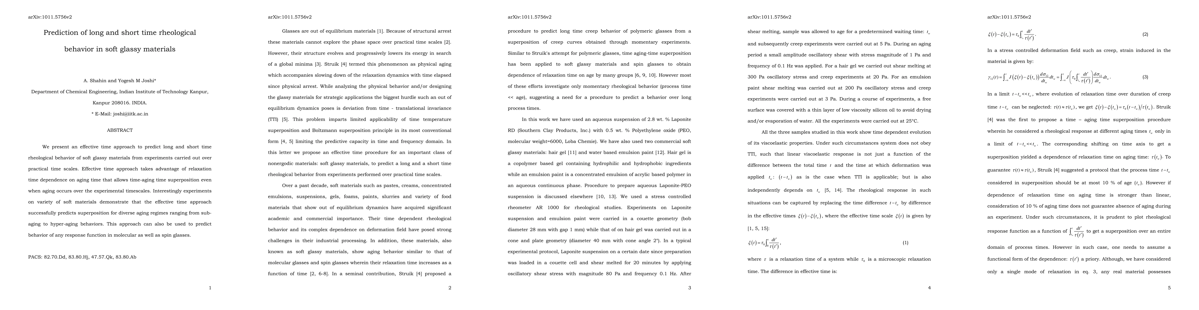 This paper proposes an effective time approach to predict the rheological behavior of soft glassy materials over both short and long time scales, leveraging relaxation time dependence on aging time for accurate superposition across experimental timescales. The method successfully predicts behavior across various aging regimes and can be applied to predict response functions in molecular and spin glasses.