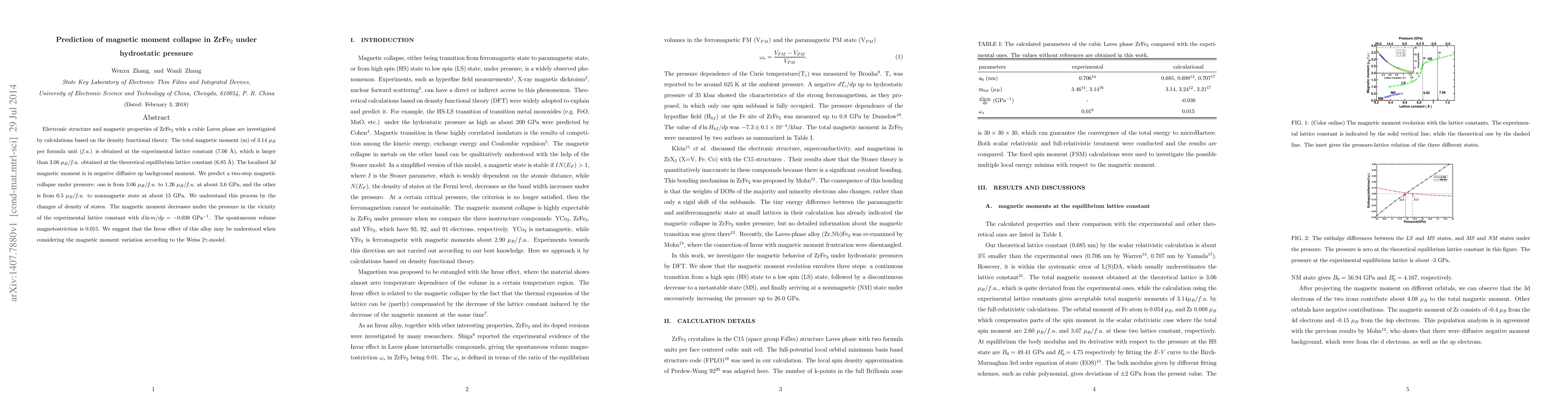 Electronic structure and magnetic properties of ZrFe$_2$ with a cubic Laves phase are investigated by calculations based on the density functional theory. The total magnetic moment (m) of 3.14 $\mu_B$ per formula unit (\emph{f.u.}) is obtained at the experimental lattice constant (7.06 \AA), which is larger than 3.06 $\mu_B$/\emph{f.u.} obtained at the theoretical equilibrium lattice constant (6.85 \AA). The localized $3d$ magnetic moment is in negative diffusive sp background moment. We predict a two-step magnetic collapse under pressure: one is from 3.06 $\mu_B$/\emph{f.u.} to 1.26 $\mu_B$/\emph{f.u.} at about 3.6 GPa, and the other is from 0.5 $\mu_B$/\emph{f.u.} to nonmagnetic state at about 15 GPa. We understand this process by the changes of density of states. The magnetic moment decreases under the pressure in the vicinity of the experimental lattice constant with $d\ln m/dp=-0.038$ GPa$^{-1}$. The spontaneous volume magnetostriction is 0.015. We suggest that the Invar effect of this alloy may be understood when considering the magnetic moment variation according to the Weiss $2\gamma$-model.