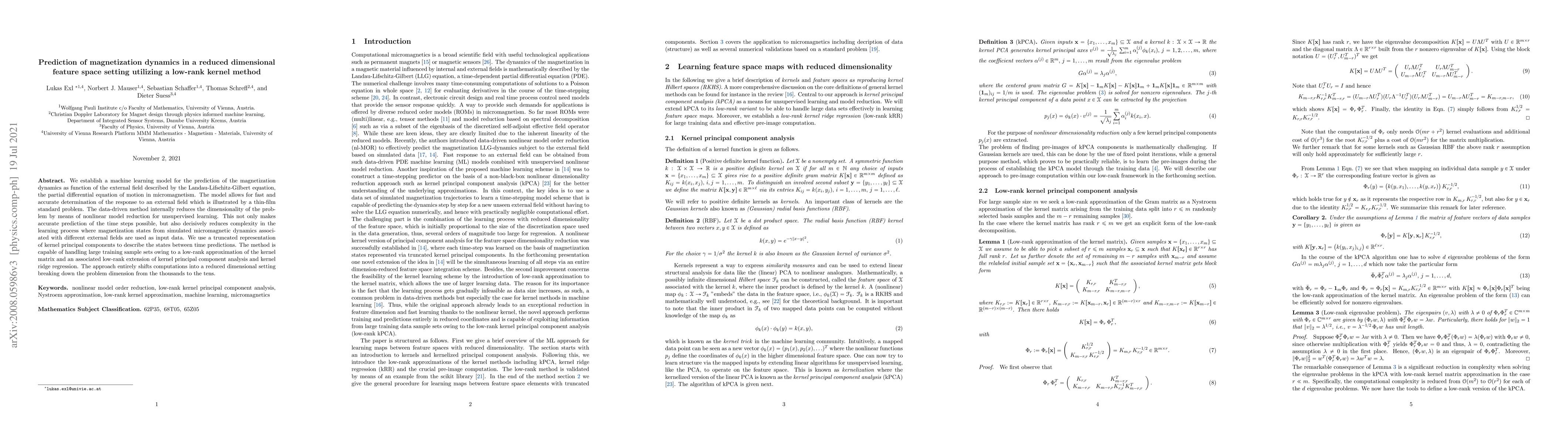 This paper presents a machine learning model for predicting magnetization dynamics using a low-rank kernel method, achieving fast and accurate predictions by reducing the problem's dimensionality through nonlinear model reduction and low-rank approximations. The method effectively handles large training datasets and simplifies computations by shifting them into a reduced dimensional feature space.