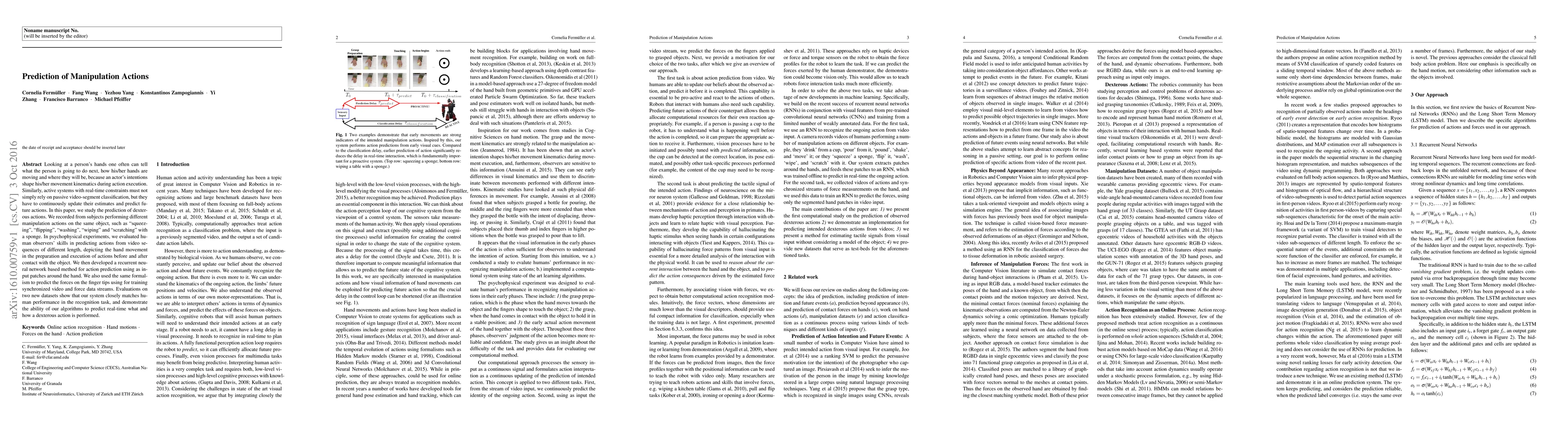 Looking at a person's hands one often can tell what the person is going to do next, how his/her hands are moving and where they will be, because an actor's intentions shape his/her movement kinematics during action execution. Similarly, active systems with real-time constraints must not simply rely on passive video-segment classification, but they have to continuously update their estimates and predict future actions. In this paper, we study the prediction of dexterous actions. We recorded from subjects performing different manipulation actions on the same object, such as "squeezing", "flipping", "washing", "wiping" and "scratching" with a sponge. In psychophysical experiments, we evaluated human observers' skills in predicting actions from video sequences of different length, depicting the hand movement in the preparation and execution of actions before and after contact with the object. We then developed a recurrent neural network based method for action prediction using as input patches around the hand. We also used the same formalism to predict the forces on the finger tips using for training synchronized video and force data streams. Evaluations on two new datasets showed that our system closely matches human performance in the recognition task, and demonstrate the ability of our algorithm to predict what and how a dexterous action is performed.