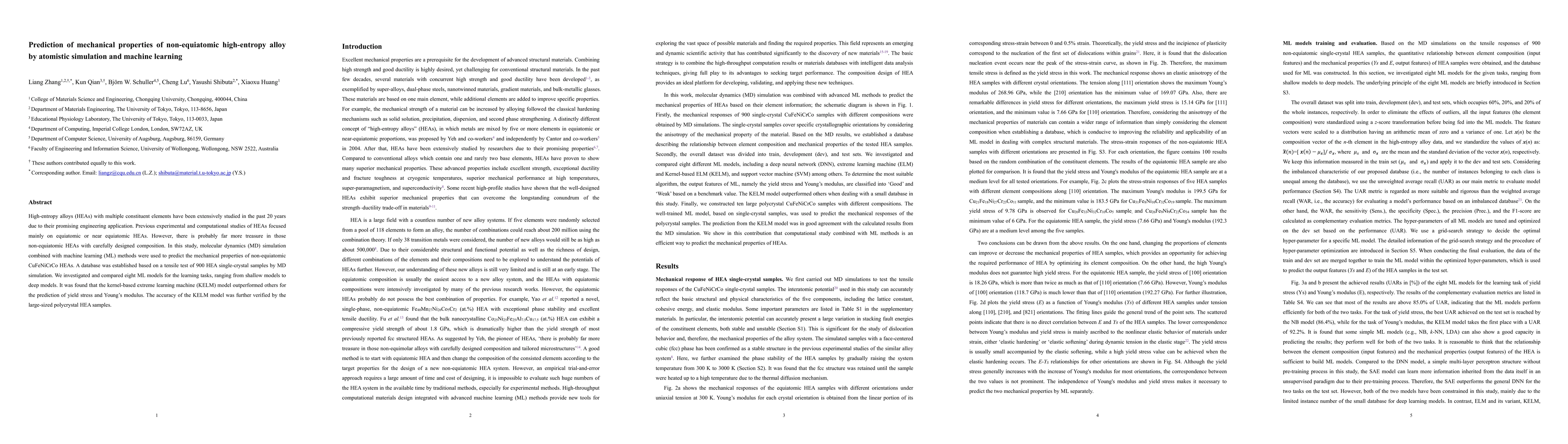 This study uses molecular dynamics simulations and machine learning to predict mechanical properties of non-equiatomic CuFeNiCrCo high-entropy alloys. The kernel-based extreme learning machine (KELM) model was found to accurately predict yield stress and Young's modulus, outperforming other models tested.
