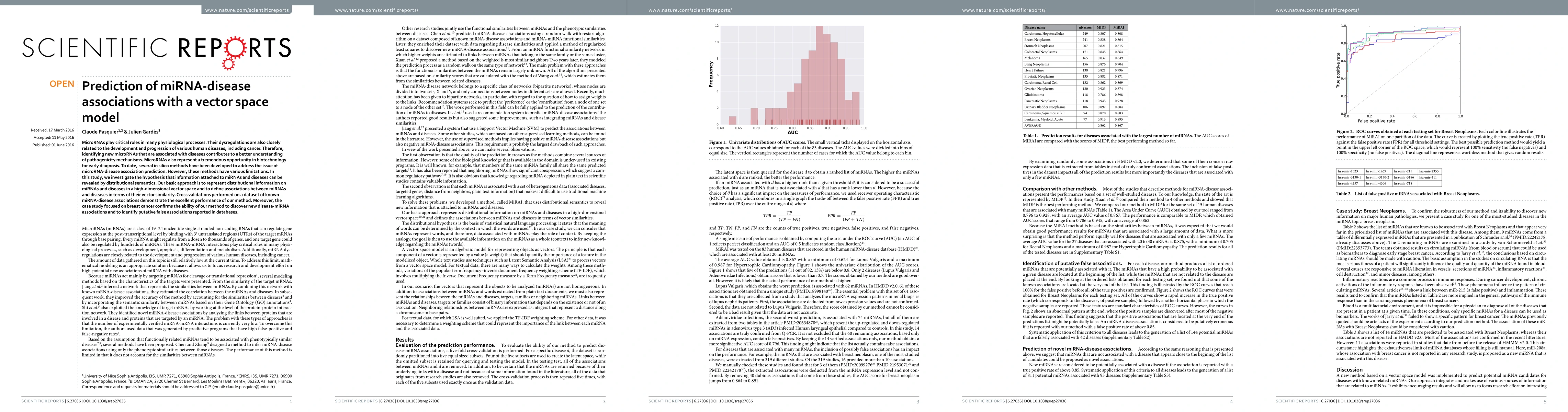 This paper proposes a vector space model for predicting miRNA-disease associations based on distributional semantics, demonstrating high accuracy in cross-validation and successfully identifying new associations and potential false associations in breast cancer.