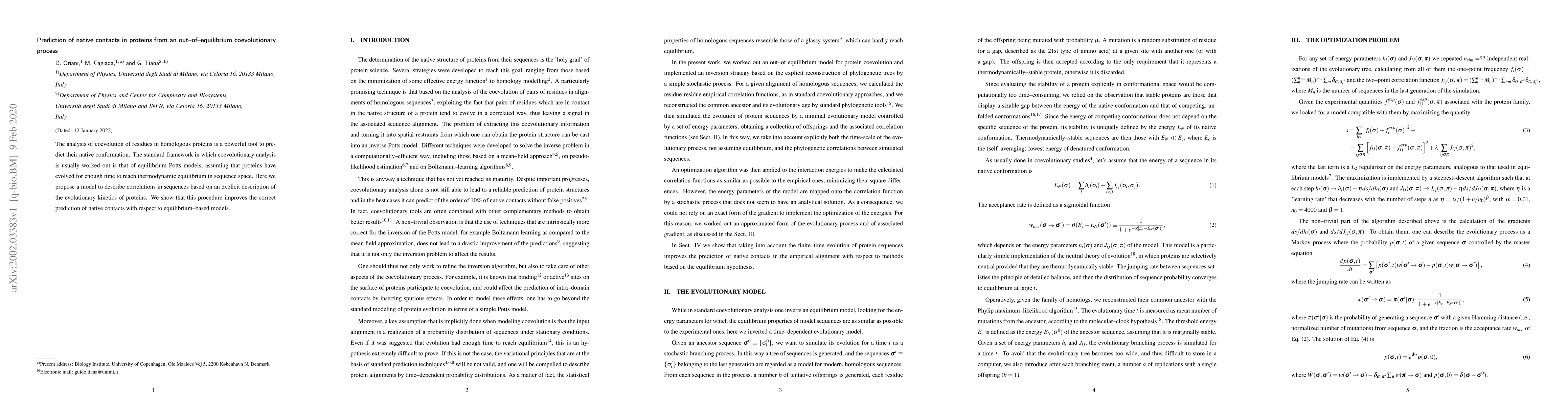 This paper proposes a new non-equilibrium coevolutionary model to predict protein native contacts, improving upon equilibrium-based Potts models by explicitly considering the evolutionary kinetics of proteins, thereby achieving better contact prediction accuracy.