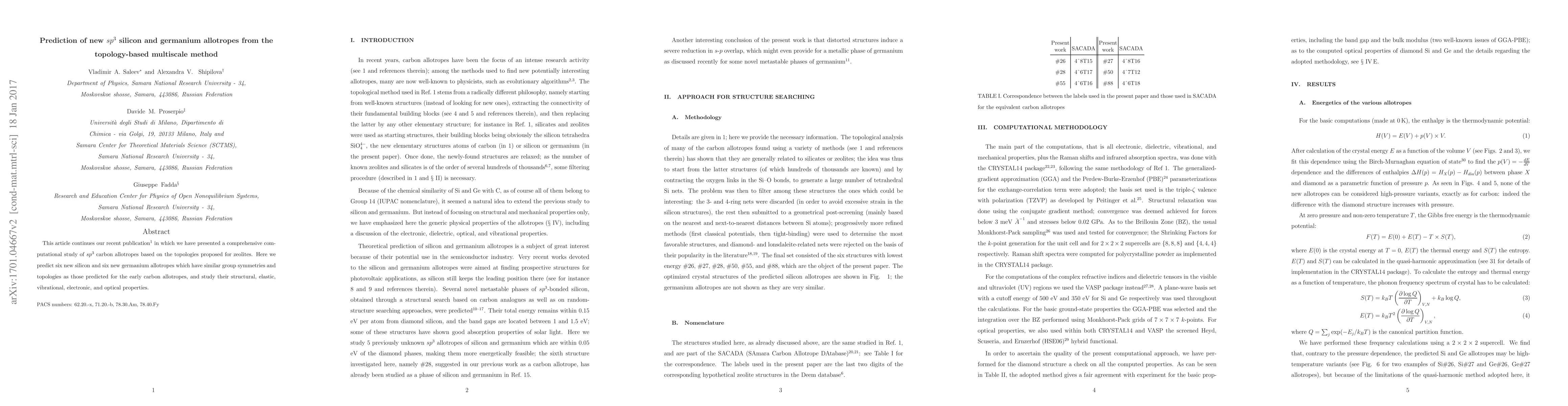 This paper predicts six new silicon and six new germanium allotropes using a topology-based multiscale method, extending previous studies on sp3 carbon allotropes. It examines their structural, elastic, vibrational, electronic, and optical properties.