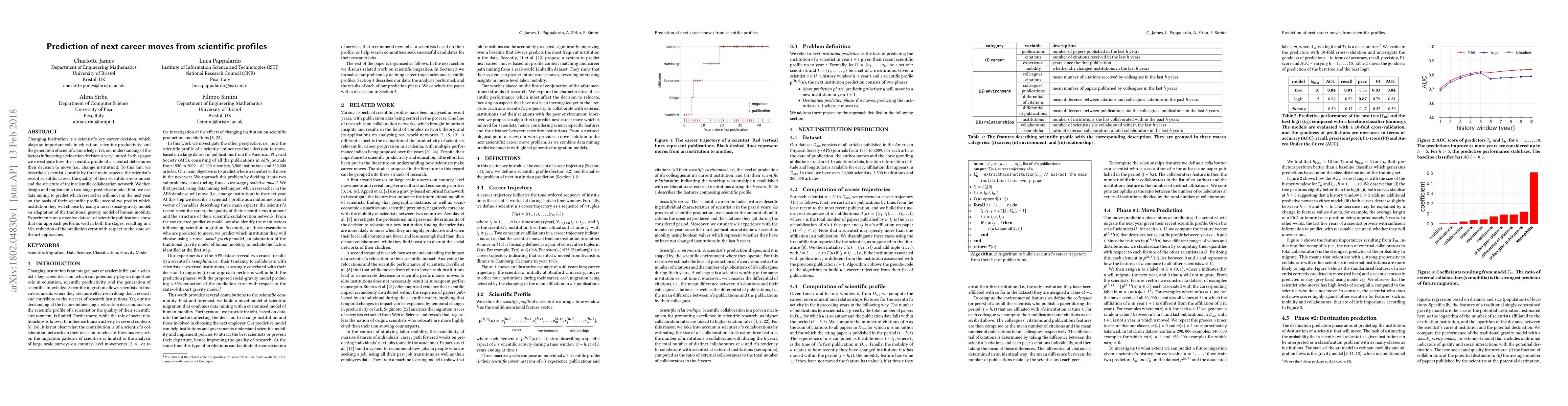 Changing institution is a scientist's key career decision, which plays an important role in education, scientific productivity, and the generation of scientific knowledge. Yet, our understanding of the factors influencing a relocation decision is very limited. In this paper we investigate how the scientific profile of a scientist determines their decision to move (i.e., change institution). To this aim, we describe a scientist's profile by three main aspects: the scientist's recent scientific career, the quality of their scientific environment and the structure of their scientific collaboration network. We then design and implement a two-stage predictive model: first, we use data mining to predict which researcher will move in the next year on the basis of their scientific profile; second we predict which institution they will choose by using a novel social-gravity model, an adaptation of the traditional gravity model of human mobility. Experiments on a massive dataset of scientific publications show that our approach performs well in both the stages, resulting in a 85% reduction of the prediction error with respect to the state-of-the-art approaches.