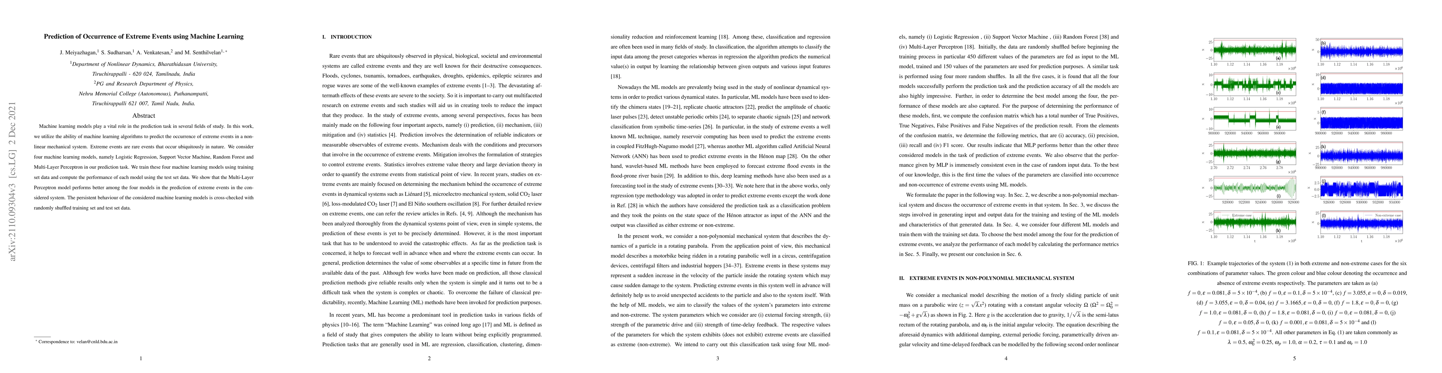 This research investigates the use of four machine learning models—Logistic Regression, Support Vector Machine, Random Forest, and Multi-Layer Perceptron—to predict extreme events in a nonlinear mechanical system. The Multi-Layer Perceptron model was found to outperform the others in this prediction task, with performance validated through cross-checking with shuffled data.