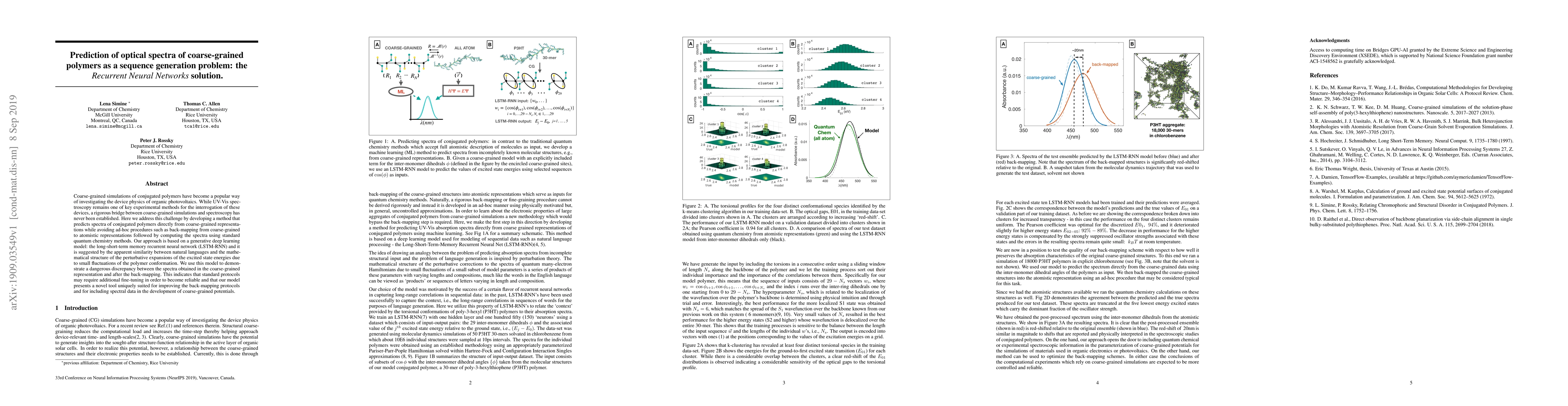 This paper proposes a long-short-term memory recurrent neural network (LSTM-RNN) to predict the optical spectra of coarse-grained conjugated polymers directly, bypassing traditional back-mapping methods. The model demonstrates significant discrepancies between spectra from coarse-grained simulations and those obtained via standard quantum chemistry methods, suggesting a need for improved back-mapping protocols.