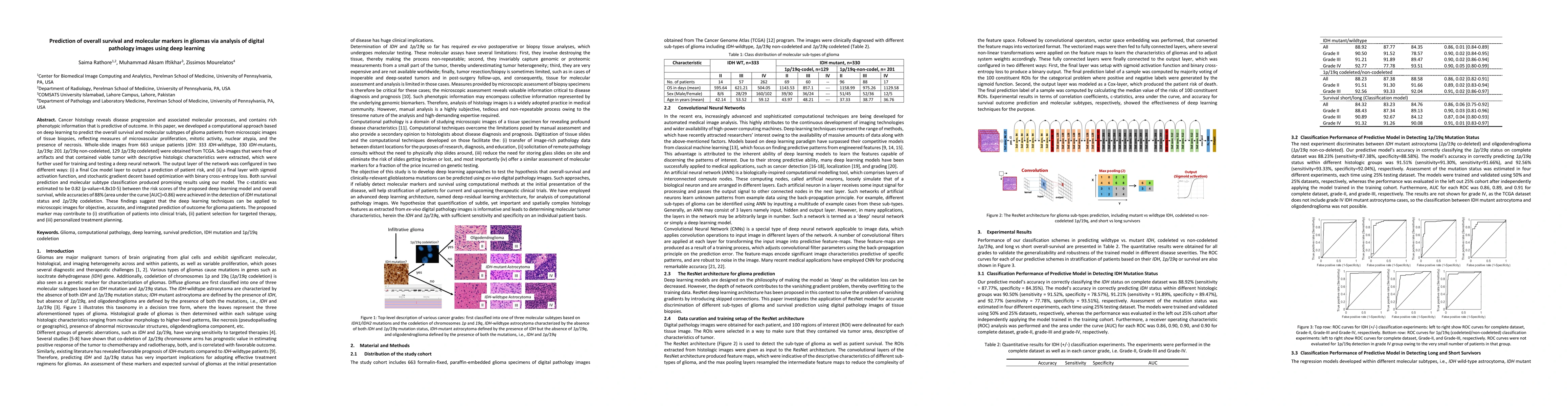 This paper presents a deep learning model that predicts overall survival and identifies molecular markers in gliomas using digital pathology images. The model achieved high accuracy in predicting patient risk and classifying molecular subtypes, suggesting its potential for clinical applications in patient stratification and personalized treatment planning.