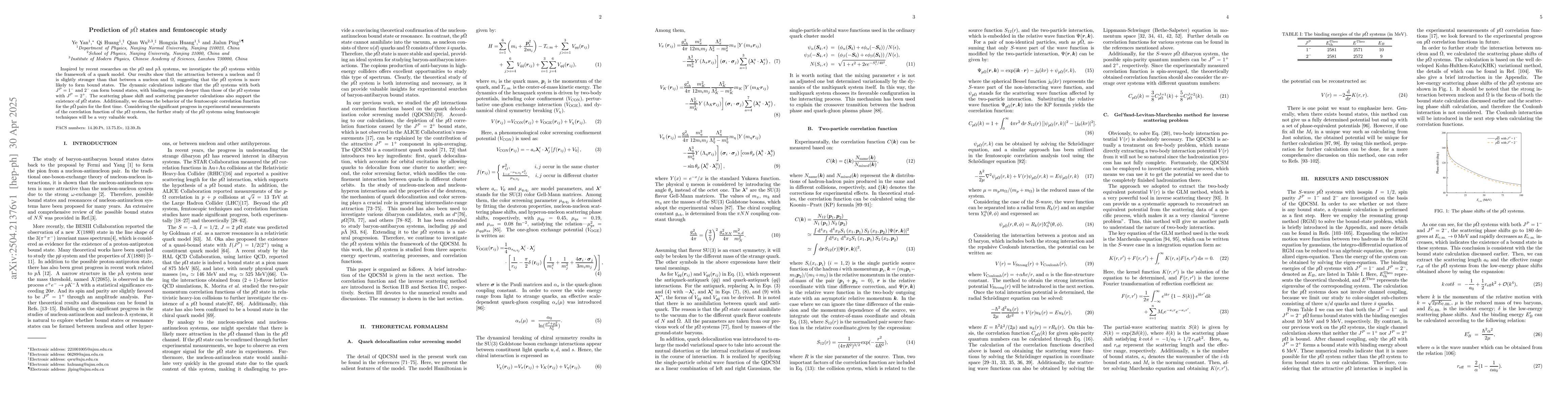 Development of a quark model to predict pΩ¯ bound states and analysis of femtoscopic correlations for these systems.
