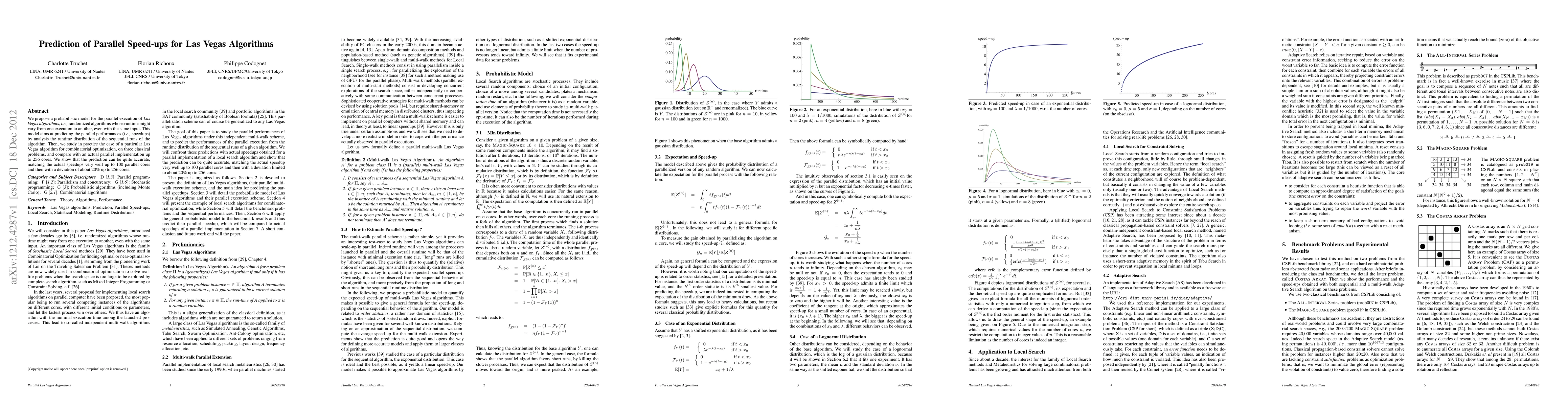 The paper proposes a probabilistic model to predict parallel speed-ups for Las Vegas algorithms by analyzing the runtime distribution of sequential runs. It studies a specific Las Vegas algorithm for combinatorial optimization on three classic problems, comparing the predictions with an actual parallel implementation up to 256 cores.