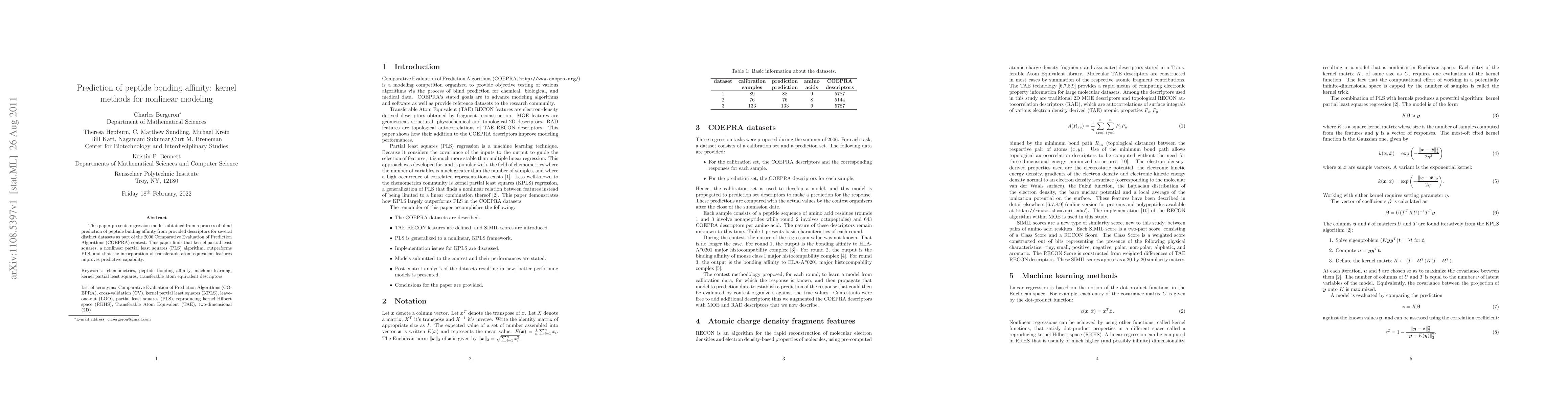 This paper presents regression models obtained from a process of blind prediction of peptide binding affinity from provided descriptors for several distinct datasets as part of the 2006 Comparative Evaluation of Prediction Algorithms (COEPRA) contest. This paper finds that kernel partial least squares, a nonlinear partial least squares (PLS) algorithm, outperforms PLS, and that the incorporation of transferable atom equivalent features improves predictive capability.