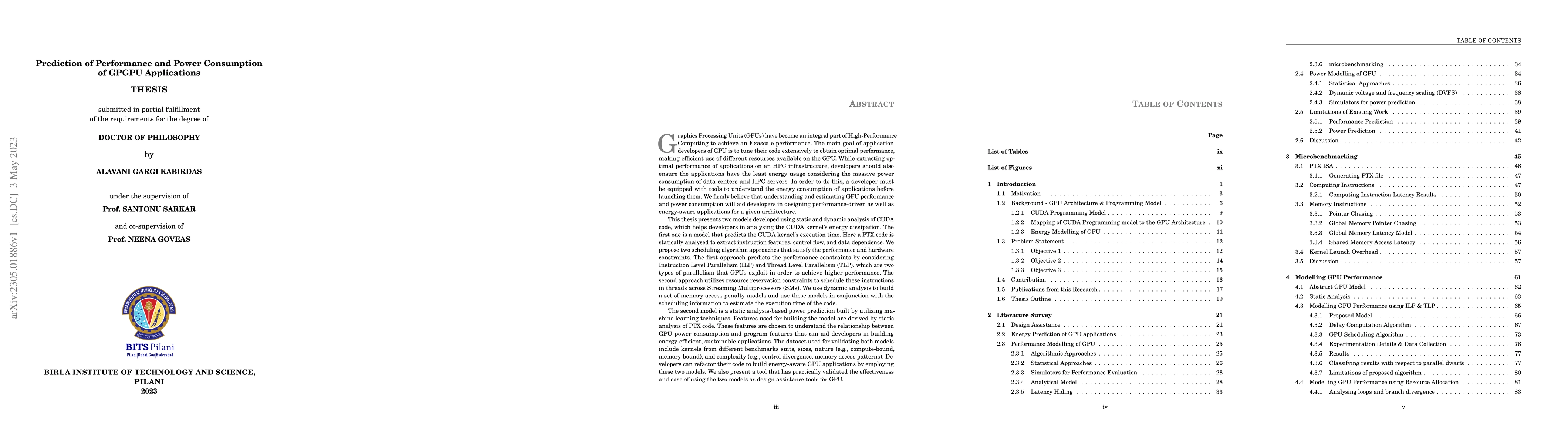 Graphics Processing Units (GPUs) have become an integral part of High-Performance Computing to achieve an Exascale performance. The main goal of application developers of GPU is to tune their code extensively to obtain optimal performance, making efficient use of different resources available. While extracting optimal performance of applications on an HPC infrastructure, developers should also ensure the applications have the least energy usage considering the massive power consumption of data centres and HPC servers. This thesis presents two models developed which can be utilized by developers in analysing the CUDA kernel's energy dissipation. The first one is a model that predicts the CUDA kernel's execution time. Here a PTX code is statically analysed to extract instruction features, control flow, and data dependence. We propose two scheduling algorithm approaches that satisfy the performance and hardware constraints. The second model is a static analysis-based power prediction built by utilizing machine learning techniques. Features used for building the model are derived using static analysis of PTX code. These features are chosen to understand the relationship between GPU power consumption and program features that can aid developers in building energy-efficient, sustainable applications. The dataset used for validating both models include kernels from different benchmarks suits, sizes, nature (e.g., compute-bound, memory-bound), and complexity (e.g., control divergence, memory access patterns). We also present a tool that has practically validated the effectiveness and ease of using the two models as design assistance tools for GPU.