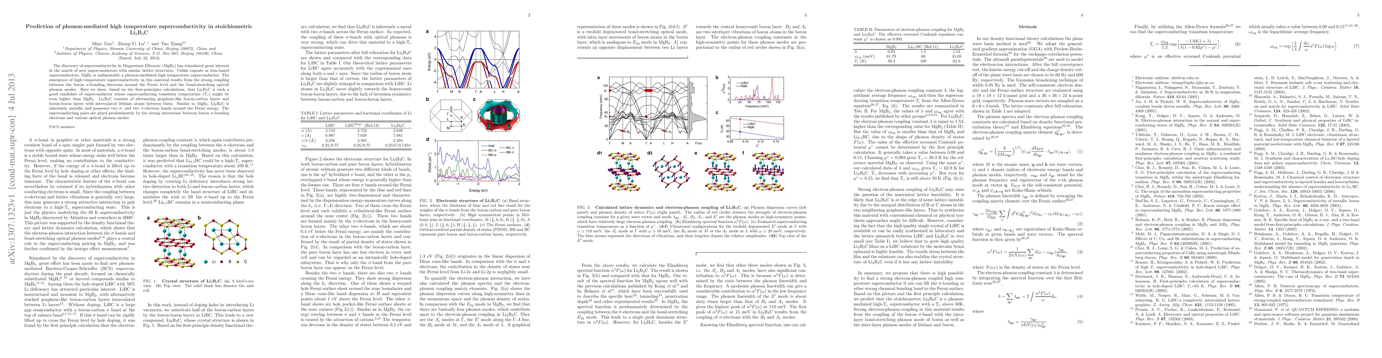 This paper predicts that Li$_2$B$_3$C, a material with a lattice structure similar to MgB$_2$, could exhibit phonon-mediated high-temperature superconductivity with a transition temperature potentially exceeding that of MgB$_2$. First-principles calculations suggest strong coupling between boron $\sigma$-bonding electrons and optical phonon modes in Li$_2$B$_3$C.