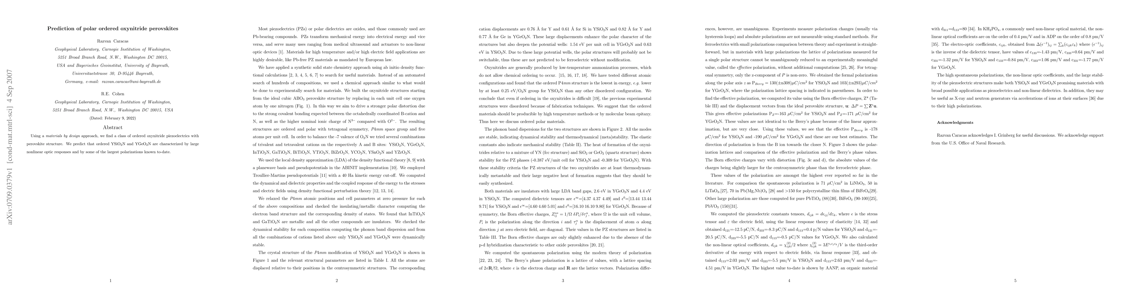 Using a materials by design approach, the authors find a class of ordered oxynitride piezoelectrics with perovskite structure. They predict that ordered YSiO2N and YGeO2N are characterized by large nonlinear optic responses and by some of the largest polarizations known to date.