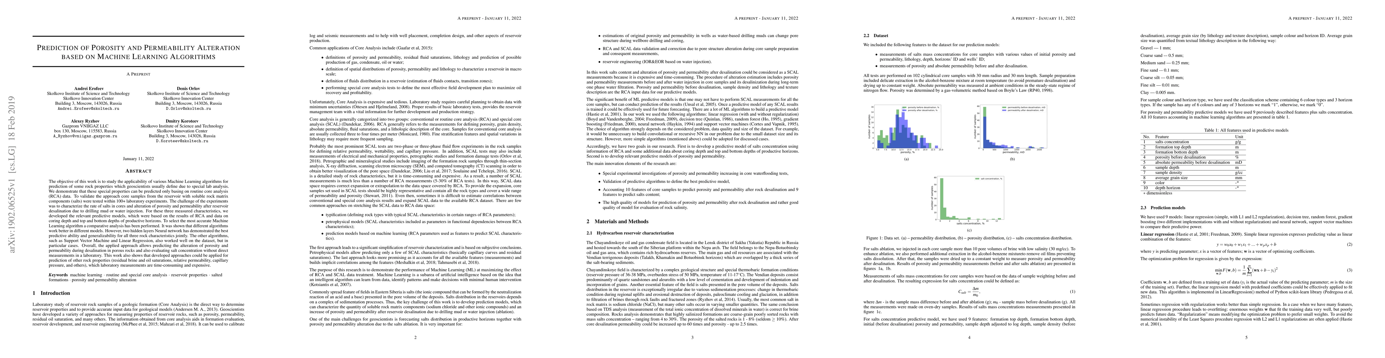 This research investigates the use of Machine Learning algorithms to predict rock porosity and permeability changes based on routine core analysis data, rather than expensive lab tests. A neural network with two hidden layers proved most effective for predicting these properties, demonstrating the potential for cost-effective reservoir management through predictive modeling.