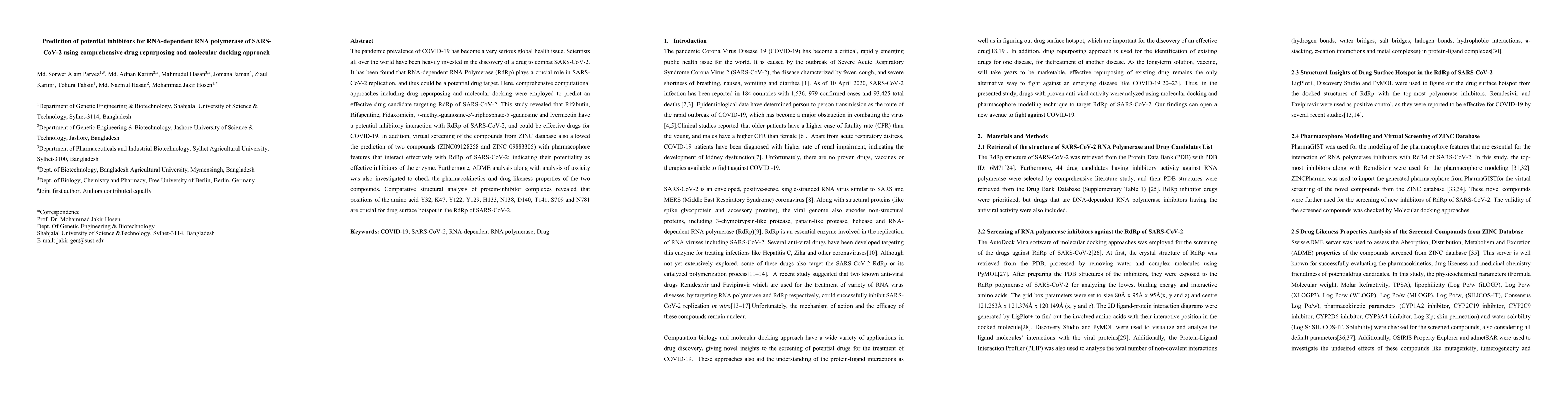The pandemic prevalence of COVID-19 has become a very serious global health issue. Scientists all over the world have been heavily invested in the discovery of a drug to combat SARS-CoV-2. It has been found that RNA-dependent RNA Polymerase (RdRp) plays a crucial role in SARS-CoV-2 replication, and thus could be a potential drug target. Here, comprehensive computational approaches including drug repurposing and molecular docking were employed to predict an effective drug candidate targeting RdRp of SARS-CoV-2. This study revealed that Rifabutin, Rifapentine, Fidaxomicin, 7-methyl-guanosine-5'-triphosphate-5'-guanosine and Ivermectin have a potential inhibitory interaction with RdRp of SARS-CoV-2, and could be effective drugs for COVID-19. In addition, virtual screening of the compounds from ZINC database also allowed the prediction of two compounds (ZINC09128258 and ZINC 09883305) with pharmacophore features that interact effectively with RdRp of SARS-CoV-2; indicating their potentiality as effective inhibitors of the enzyme. Furthermore, ADME analysis along with analysis of toxicity was also investigated to check the pharmacokinetics and drug-likeness properties of the two compounds. Comparative structural analysis of protein-inhibitor complexes revealed that positions of the amino acid Y32, K47, Y122, Y129, H133, N138, D140, T141, S709 and N781 are crucial for drug surface hotspot in the RdRp of SARS-CoV-2.