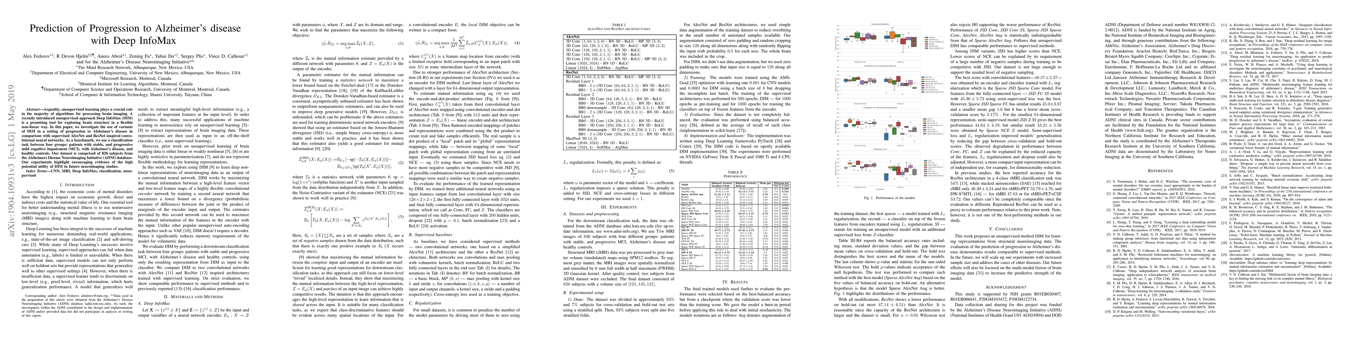 Arguably, unsupervised learning plays a crucial role in the majority of algorithms for processing brain imaging. A recently introduced unsupervised approach Deep InfoMax (DIM) is a promising tool for exploring brain structure in a flexible non-linear way. In this paper, we investigate the use of variants of DIM in a setting of progression to Alzheimer's disease in comparison with supervised AlexNet and ResNet inspired convolutional neural networks. As a benchmark, we use a classification task between four groups: patients with stable, and progressive mild cognitive impairment (MCI), with Alzheimer's disease, and healthy controls. Our dataset is comprised of 828 subjects from the Alzheimer's Disease Neuroimaging Initiative (ADNI) database. Our experiments highlight encouraging evidence of the high potential utility of DIM in future neuroimaging studies.