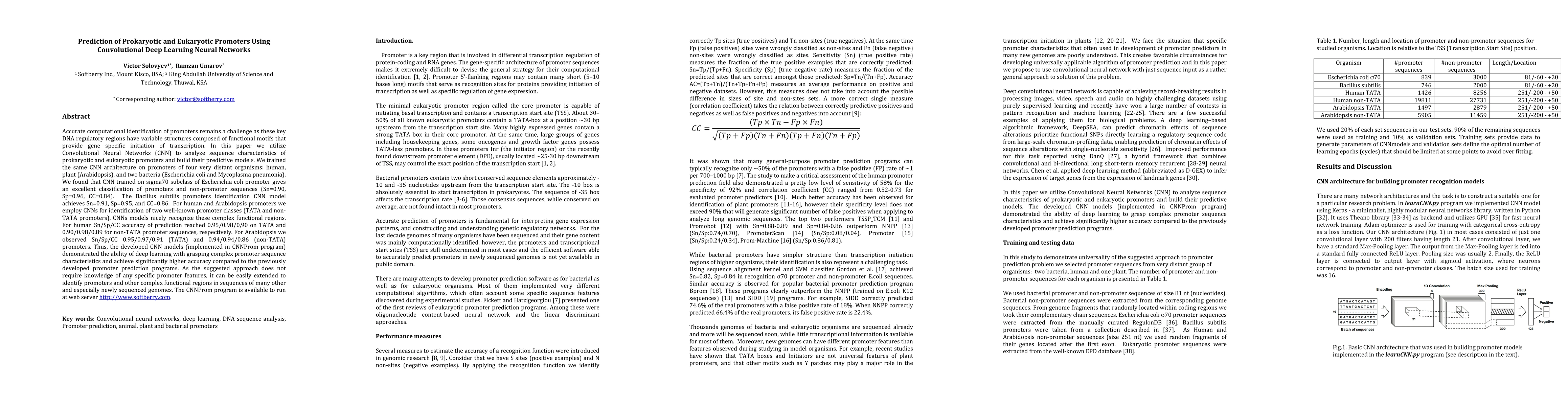 Accurate computational identification of promoters remains a challenge as these key DNA regulatory regions have variable structures composed of functional motifs that provide gene specific initiation of transcription. In this paper we utilize Convolutional Neural Networks (CNN) to analyze sequence characteristics of prokaryotic and eukaryotic promoters and build their predictive models. We trained the same CNN architecture on promoters of four very distant organisms: human, plant (Arabidopsis), and two bacteria (Escherichia coli and Mycoplasma pneumonia). We found that CNN trained on sigma70 subclass of Escherichia coli promoter gives an excellent classification of promoters and non-promoter sequences (Sn=0.90, Sp=0.96, CC=0.84). The Bacillus subtilis promoters identification CNN model achieves Sn=0.91, Sp=0.95, and CC=0.86. For human and Arabidopsis promoters we employ CNNs for identification of two well-known promoter classes (TATA and non-TATA promoters). CNNs models nicely recognize these complex functional regions. For human Sn/Sp/CC accuracy of prediction reached 0.95/0.98/0,90 on TATA and 0.90/0.98/0.89 for non-TATA promoter sequences, respectively. For Arabidopsis we observed Sn/Sp/CC 0.95/0.97/0.91 (TATA) and 0.94/0.94/0.86 (non-TATA) promoters. Thus, the developed CNN models (implemented in CNNProm program) demonstrated the ability of deep learning with grasping complex promoter sequence characteristics and achieve significantly higher accuracy compared to the previously developed promoter prediction programs. As the suggested approach does not require knowledge of any specific promoter features, it can be easily extended to identify promoters and other complex functional regions in sequences of many other and especially newly sequenced genomes. The CNNProm program is available to run at web server http://www.softberry.com.