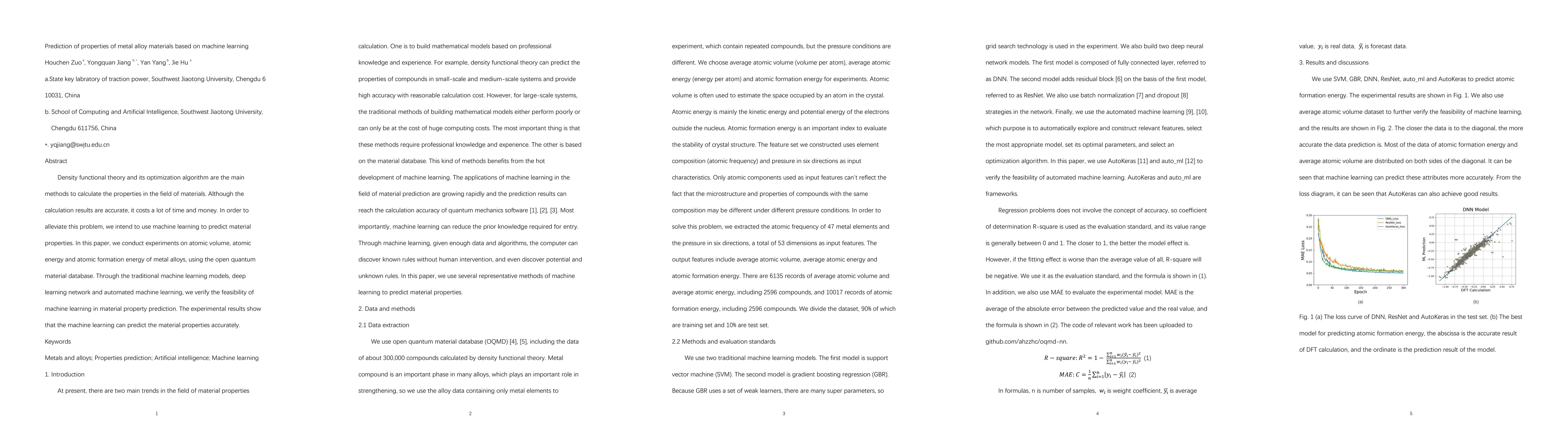 This paper explores using machine learning to predict properties of metal alloy materials, aiming to reduce the time and cost of traditional density functional theory calculations. Experiments on atomic volume, energy, and formation energy show that machine learning models, including deep learning and automated methods, can accurately predict material properties.