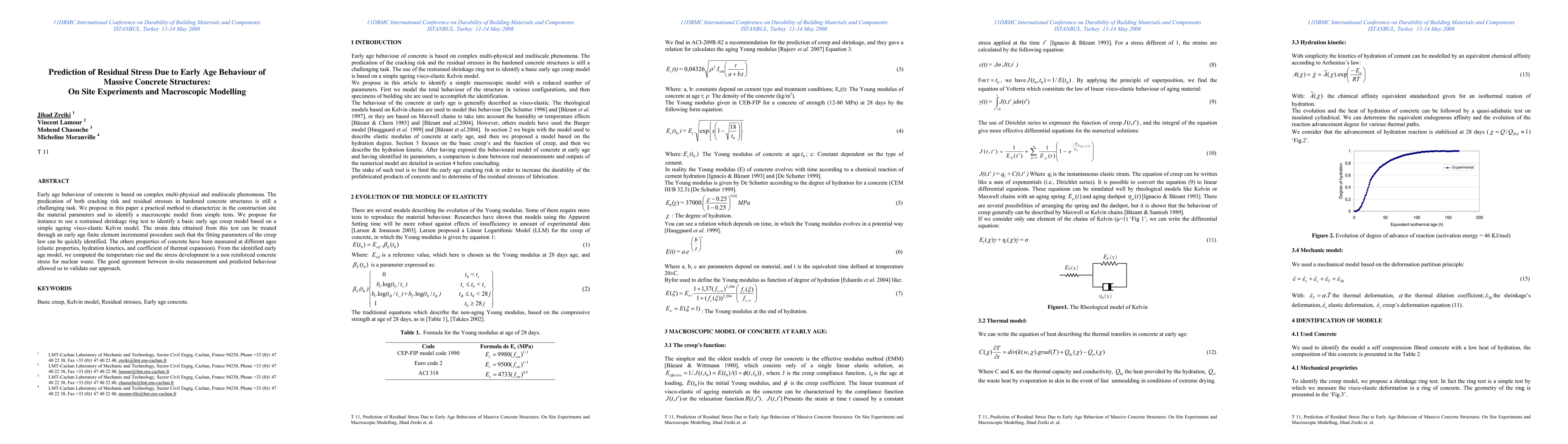This paper presents a practical method for predicting residual stresses in massive concrete structures due to early age behaviour, using on-site experiments and macroscopic modelling. The authors propose a restrained shrinkage ring test to identify material parameters and validate their approach through good agreement between in-situ measurements and predicted stress development.