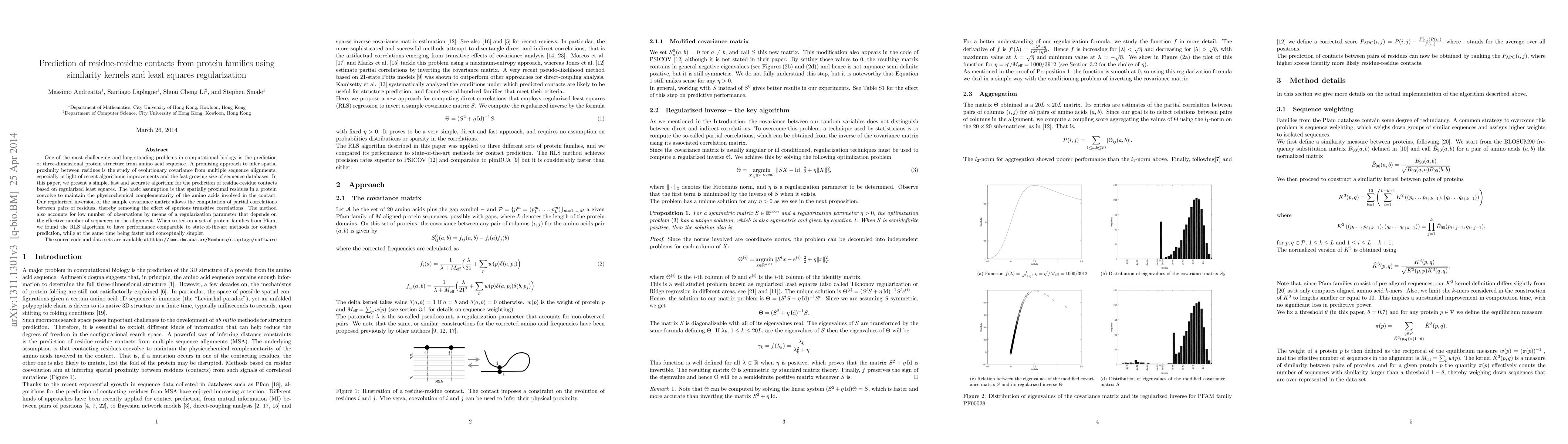 This paper proposes a fast and accurate algorithm for predicting residue-residue contacts using regularized least squares, which leverages evolutionary covariance from sequence alignments to infer spatial proximity. The method effectively removes spurious correlations and performs competitively compared to state-of-the-art techniques.