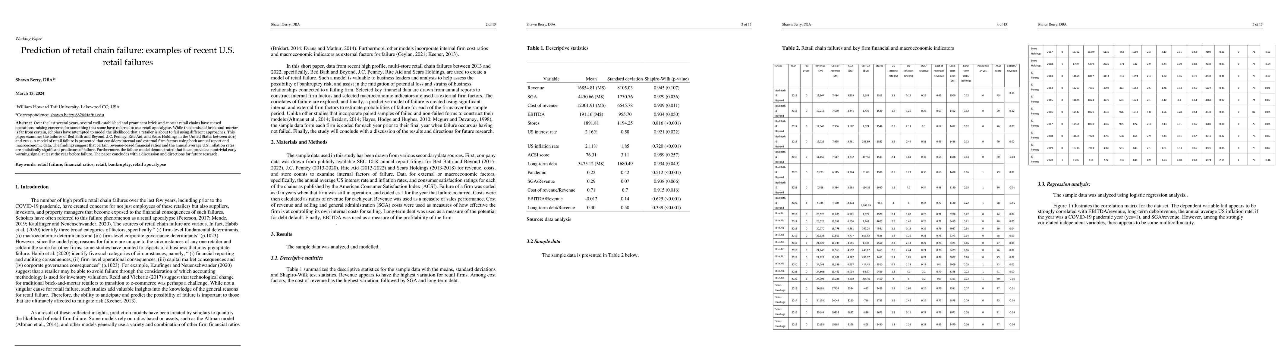 Over the last several years, several well-established and prominent brick-and-mortar retail chains have ceased operations, raising concerns for something that some have referred to as a retail apocalypse. While the demise of brick-and-mortar is far from certain, scholars have attempted to model the likelihood that a retailer is about to fail using different approaches. This paper examines the failures of Bed Bath and Beyond, J.C. Penney, Rite Aid, and Sears Holdings in the United States between 2013 and 2022. A model of retail failure is presented that considers internal and external firm factors using both annual report and macroeconomic data. The findings suggest that certain revenue-based financial ratios and the annual average U.S. inflation rates are statistically significant predictors of failure. Furthermore, the failure model demonstrated that it can provide a nontrivial early warning signal at least the year before failure. The paper concludes with a discussion and directions for future research.