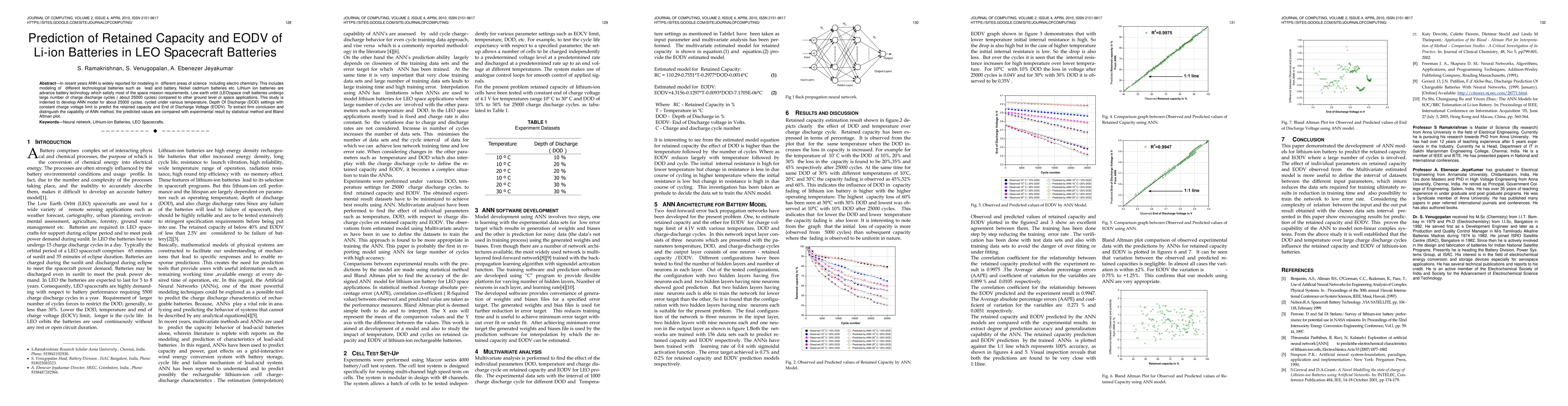 In resent years ANN is widely reported for modeling in different areas of science including electro chemistry. This includes modeling of different technological batteries such as lead acid battery, Nickel cadmium batteries etc. Lithium ion batteries are advance battery technology which satisfy most of the space mission requirements. Low earth orbit (LEO)space craft batteries undergo large number of charge discharge cycles (about 25000 cycles)compared to other ground level or space applications. This study is indented to develop ANN model for about 25000 cycles, cycled under various temperature, Depth Of Discharge (DOD) settings with constant charge voltage limit to predict the retained capacity and End of Discharge Voltage (EODV). To extract firm conclusion and distinguish the capability of ANN method, the predicted values are compared with experimental result by statistical method and Bland Altman plot.
