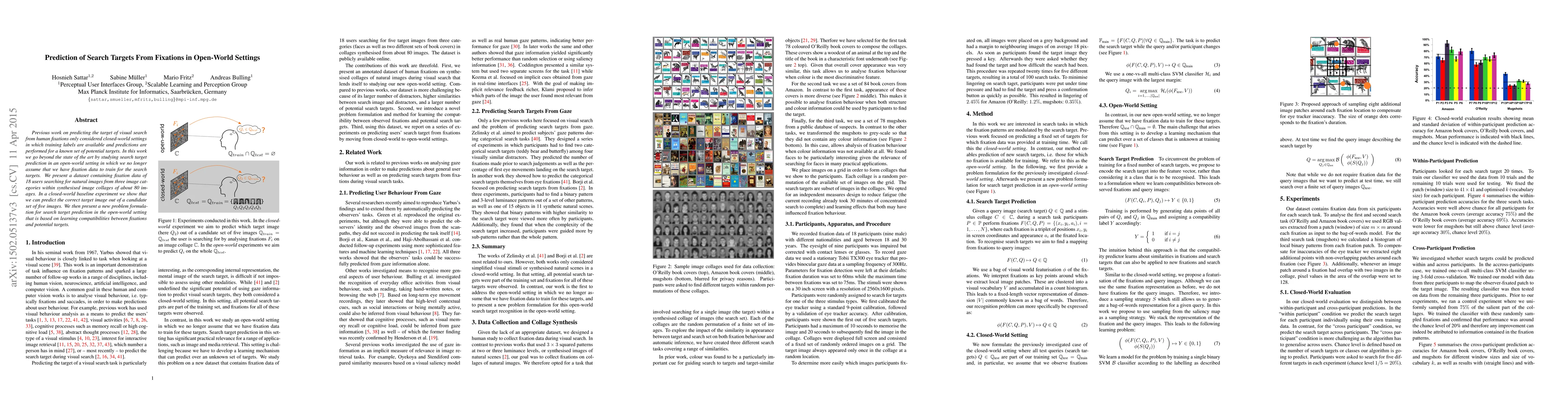 Previous work on predicting the target of visual search from human fixations only considered closed-world settings in which training labels are available and predictions are performed for a known set of potential targets. In this work we go beyond the state of the art by studying search target prediction in an open-world setting in which we no longer assume that we have fixation data to train for the search targets. We present a dataset containing fixation data of 18 users searching for natural images from three image categories within synthesised image collages of about 80 images. In a closed-world baseline experiment we show that we can predict the correct target image out of a candidate set of five images. We then present a new problem formulation for search target prediction in the open-world setting that is based on learning compatibilities between fixations and potential targets.