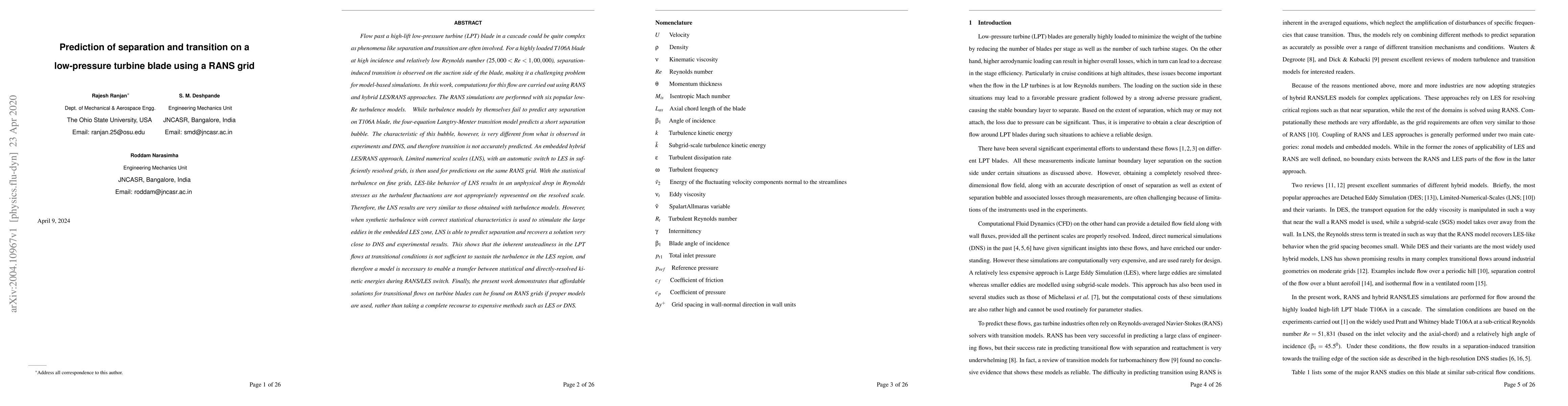 This paper investigates the prediction of separation and transition on a high-lift low-pressure turbine blade using RANS simulations and hybrid LES/RANS approaches. While RANS models fail to predict separation, the Langtry-Menter transition model shows a short separation bubble, but inaccurately. Hybrid LES/RANS results are unphysical without synthetic turbulence, but with it, the method closely matches DNS and experimental data.